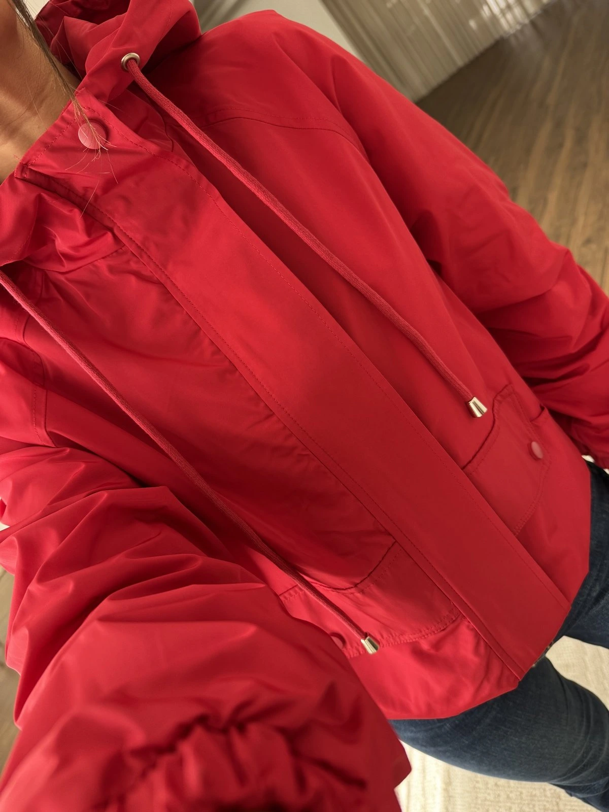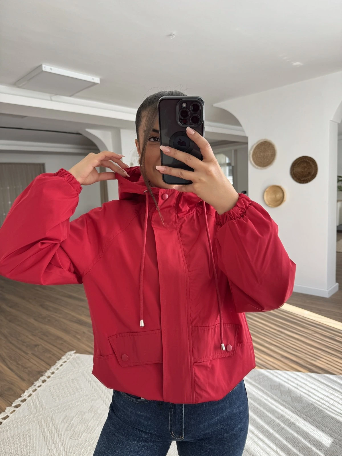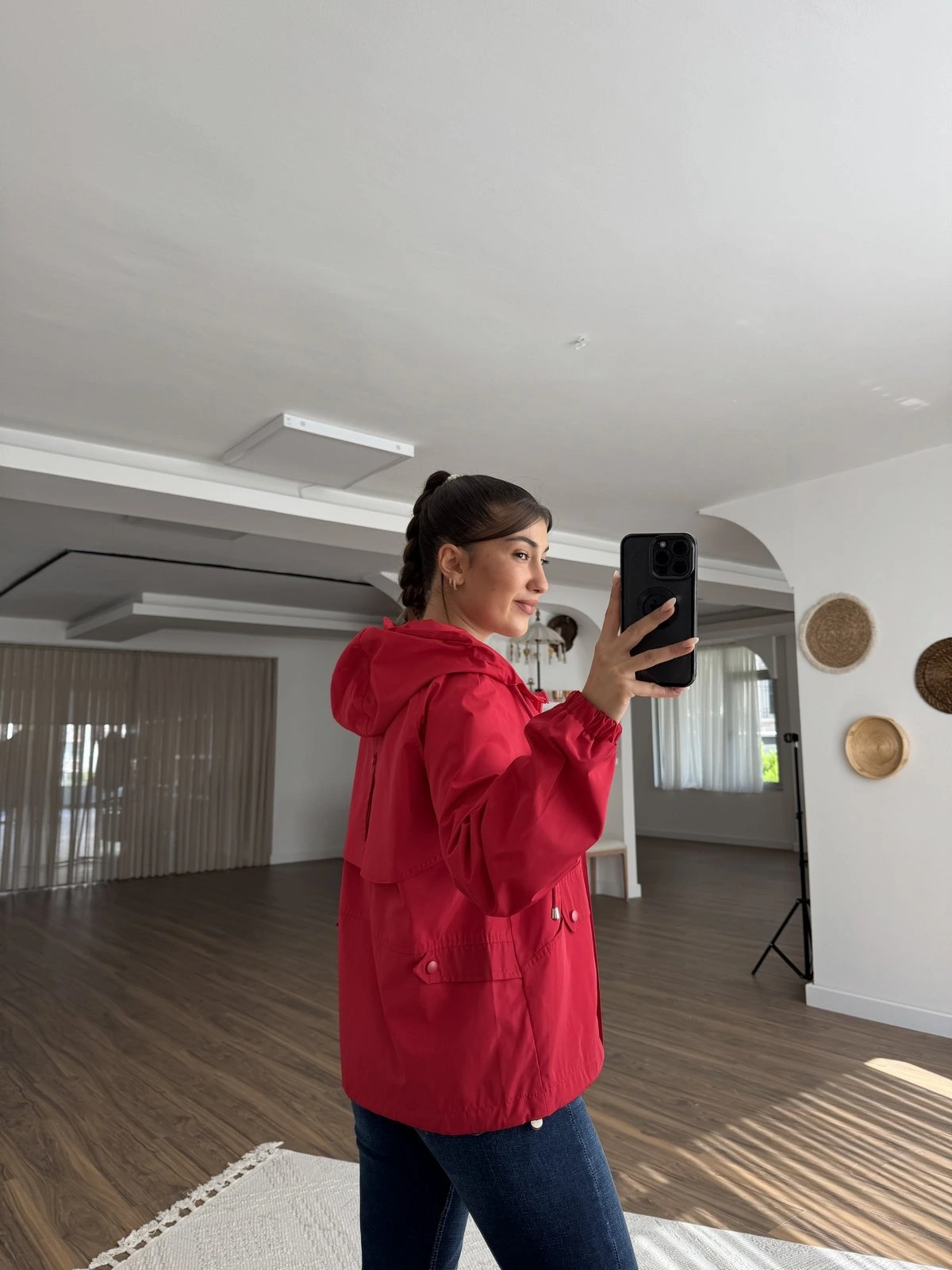 KAPÜŞONLU BEL BÜZGÜ DETAY İNCE YAĞMURLUK – KIRMIZI