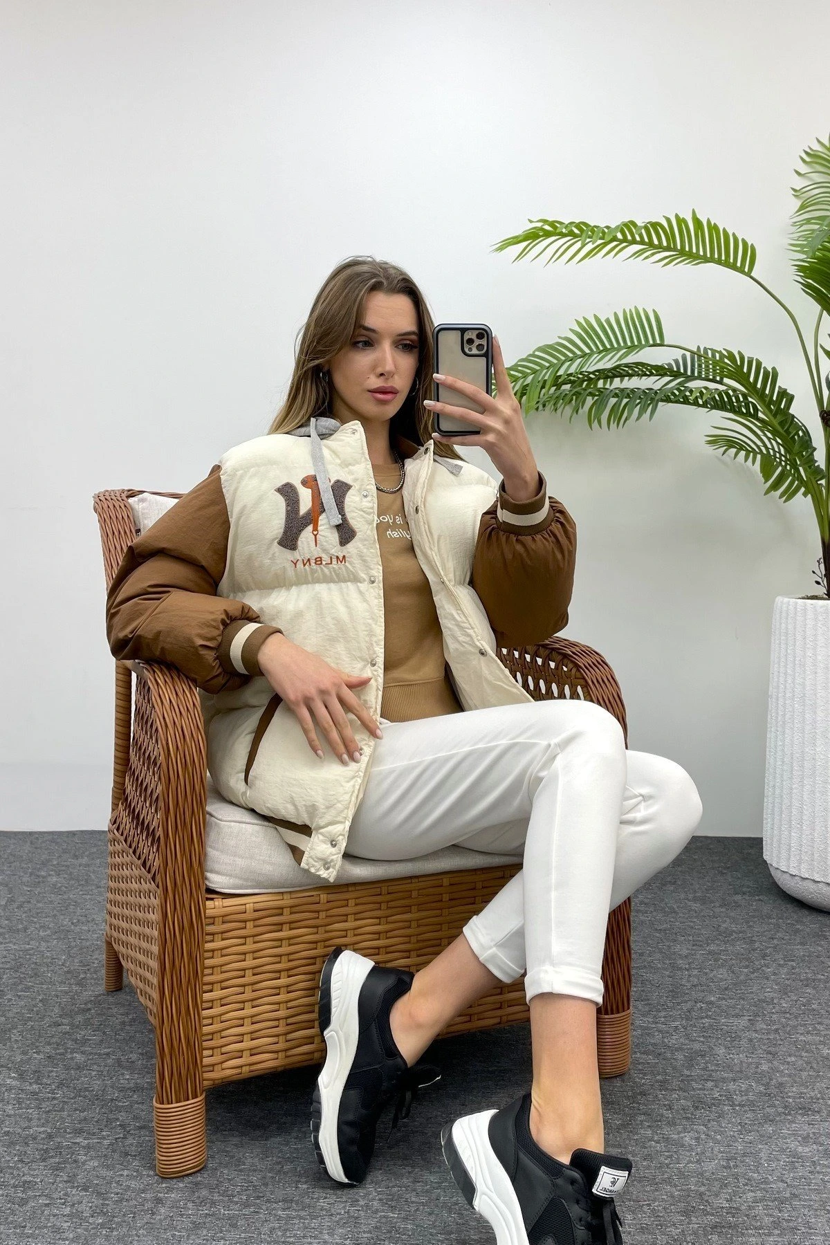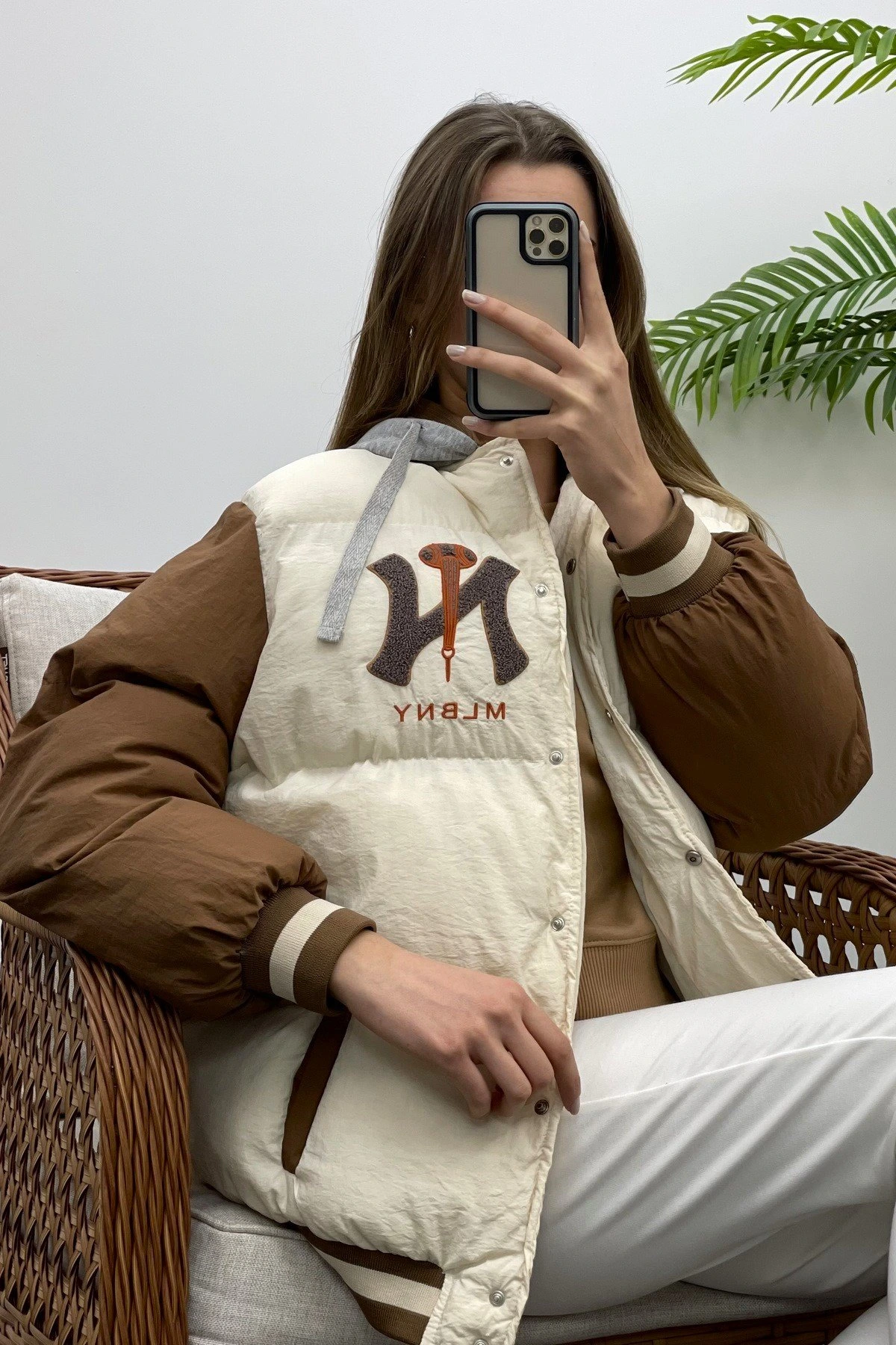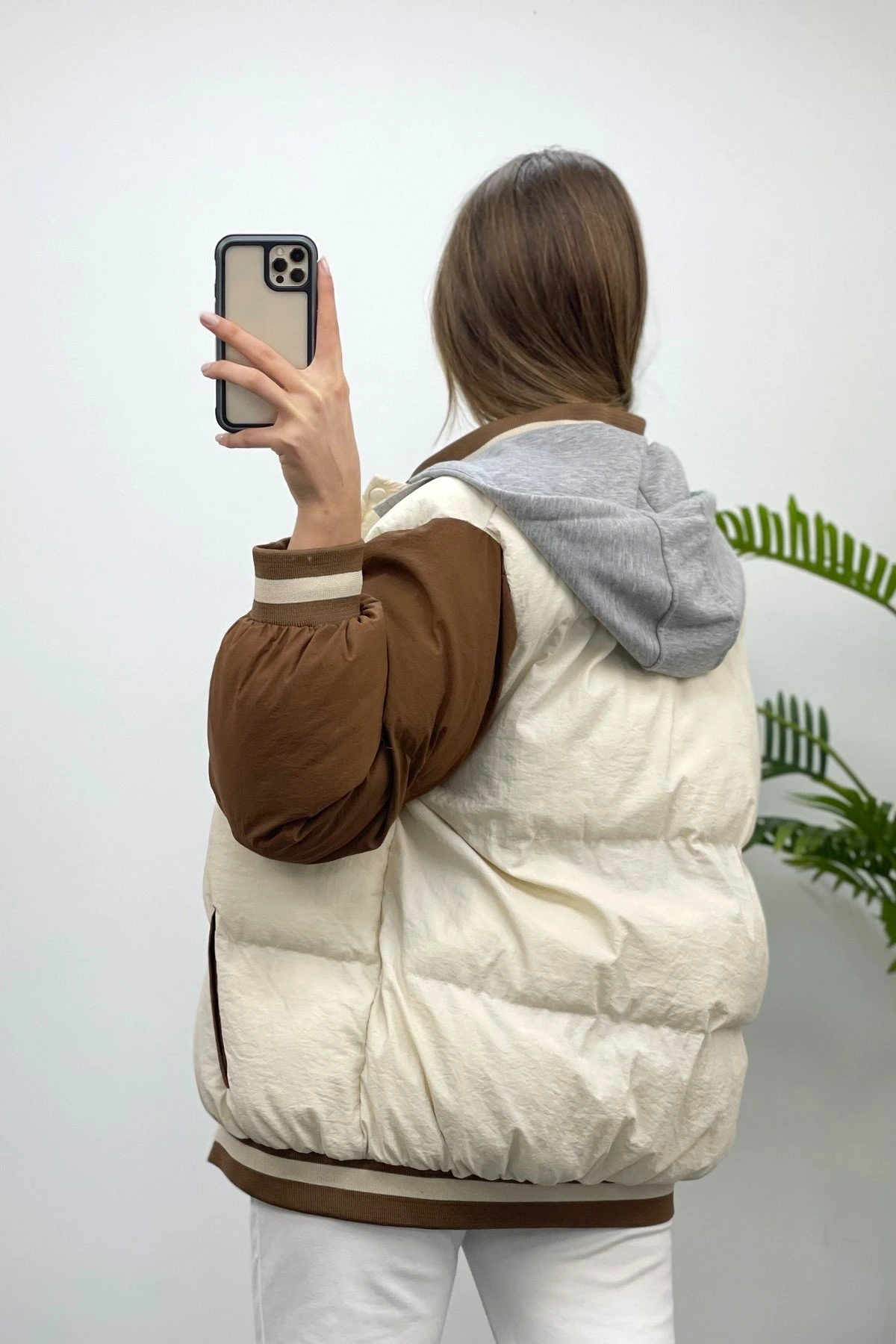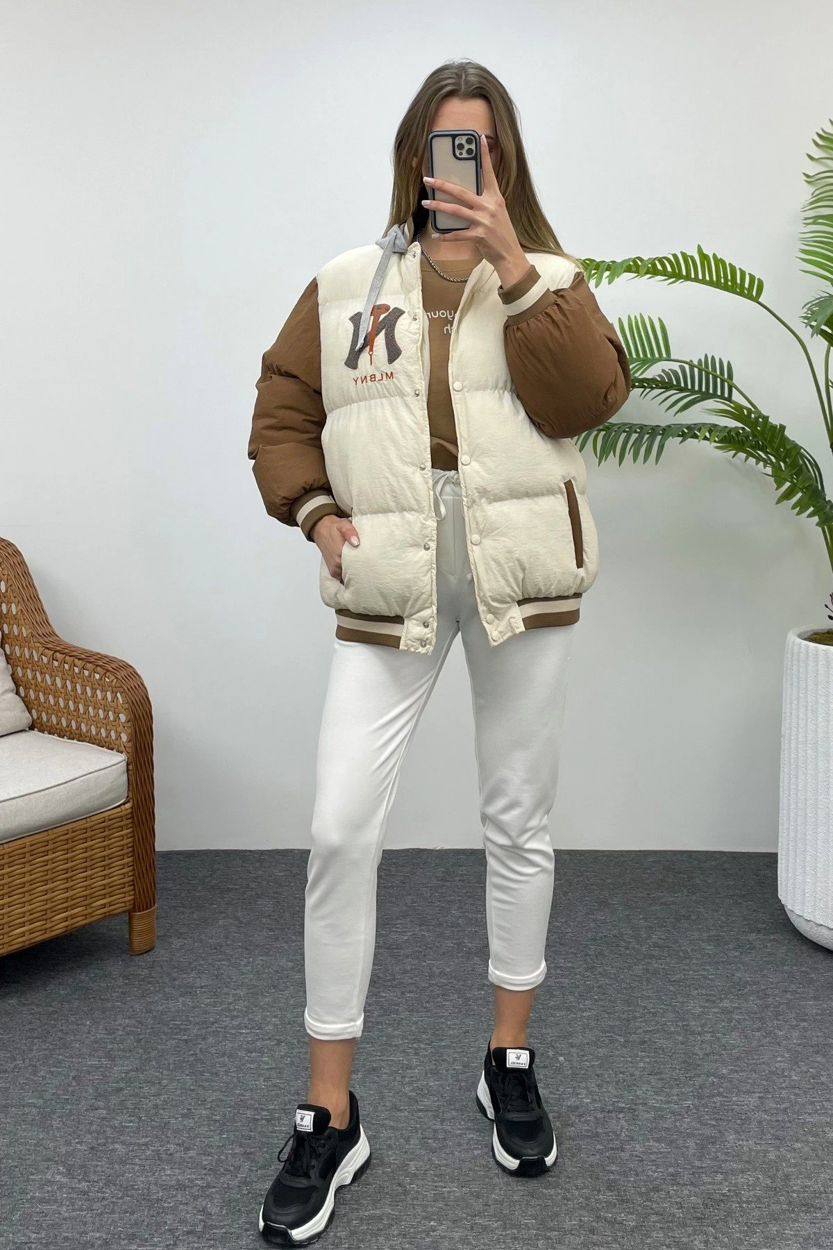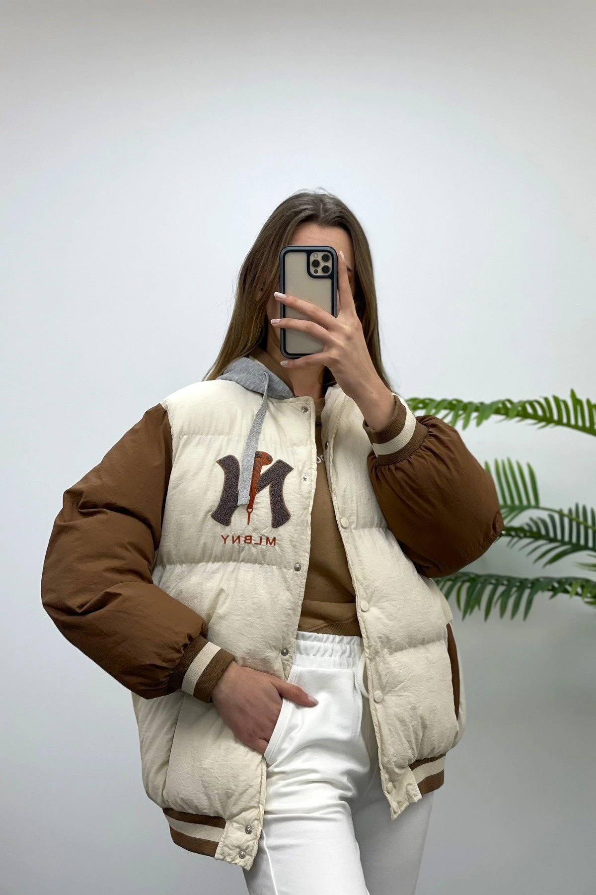 KAPÜŞONLU NAKIŞ DETAY ŞİŞME MONT – KAHVE