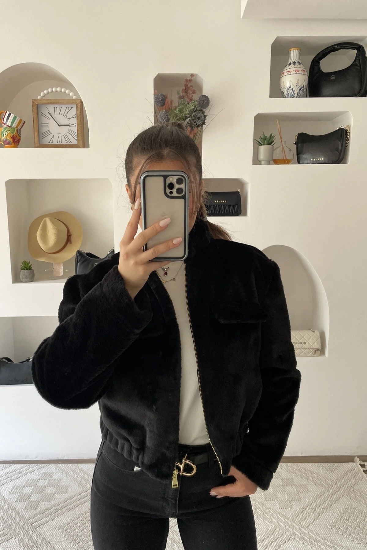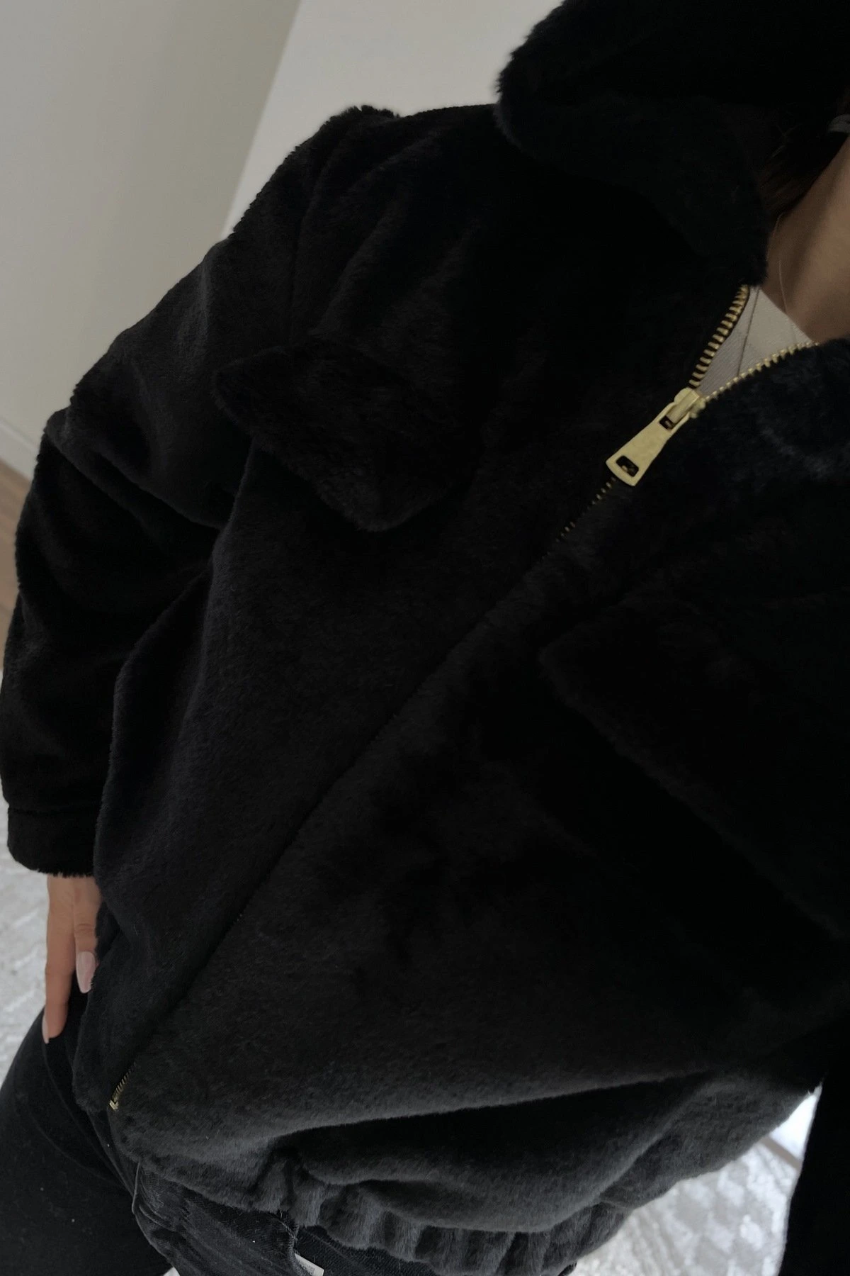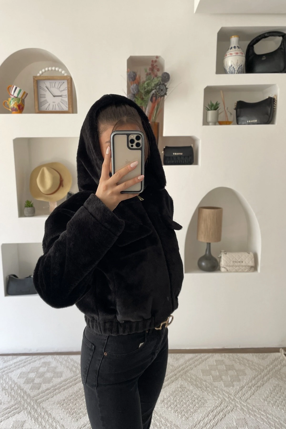 KAPÜŞONLU YAN CEPLİ BEL LASTİK PELUŞ MONT – SİYAH
