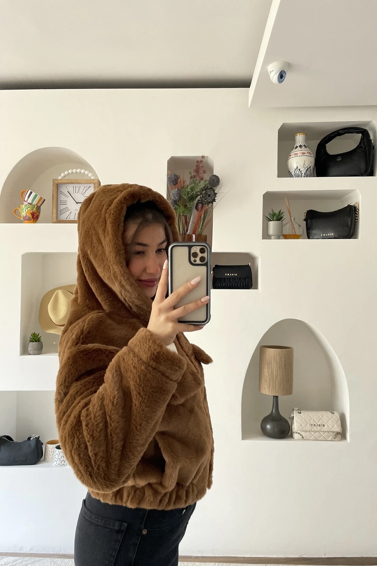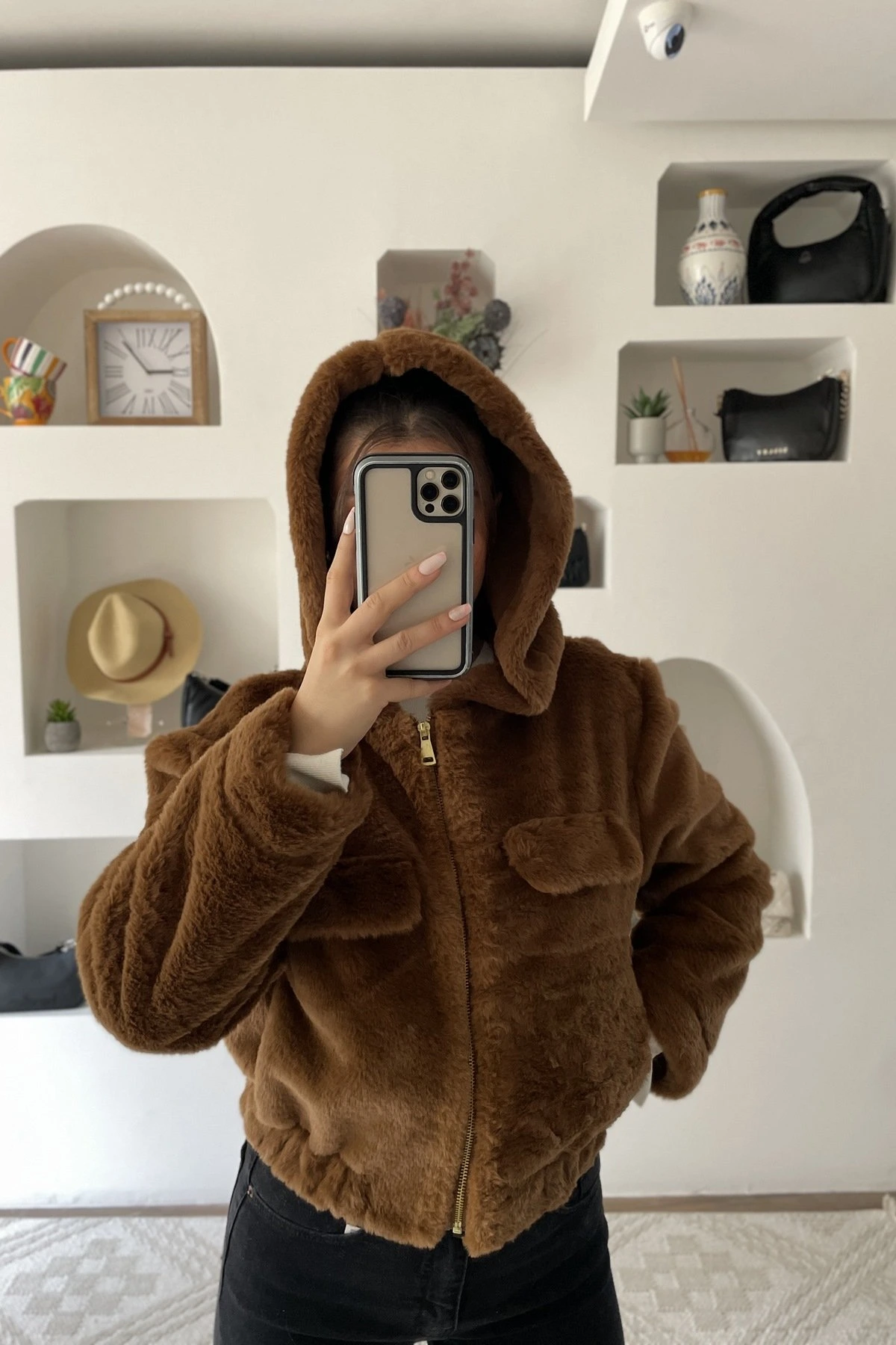 KAPÜŞONLU YAN CEPLİ BEL LASTİK PELUŞ MONT – TABA