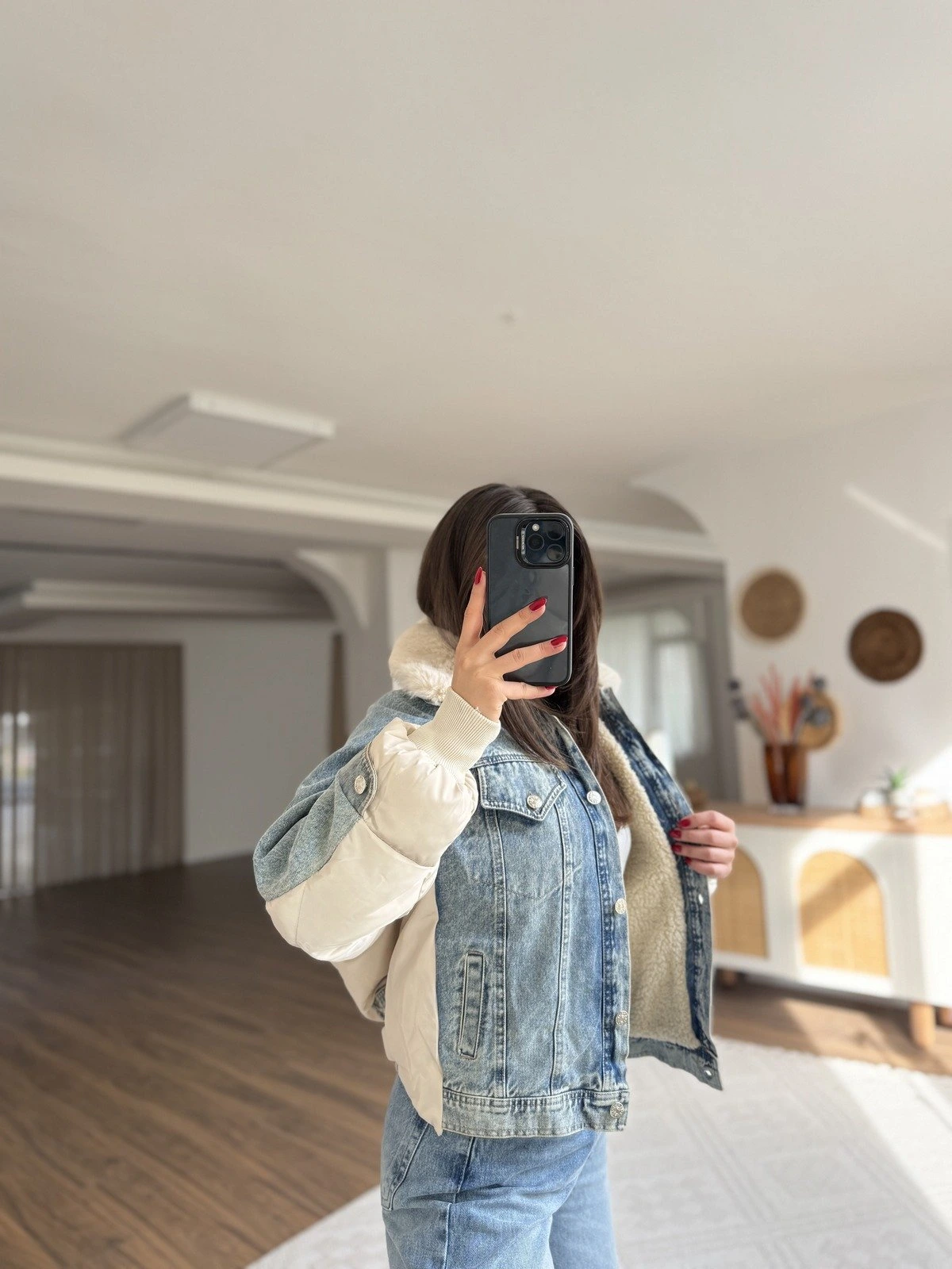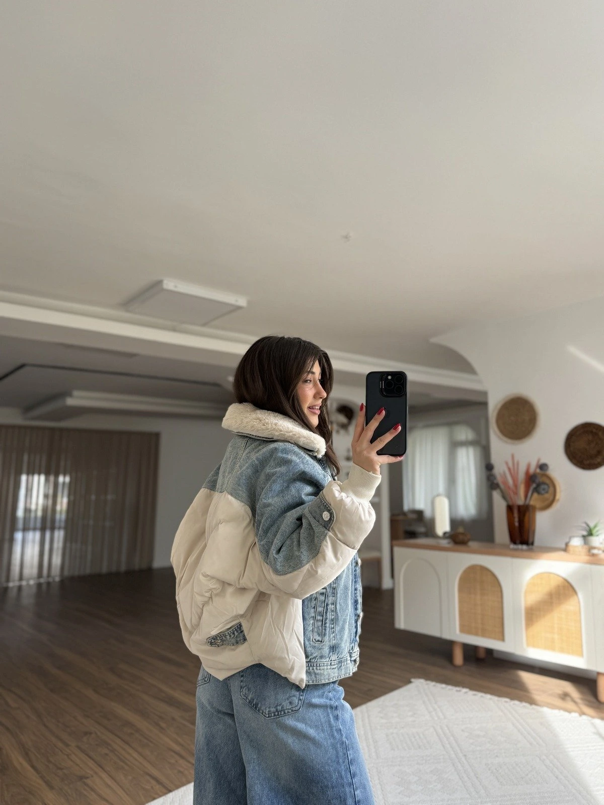 ÖN İÇ PELUŞ KÜRK YAKA ÇIKABİLEN JEAN DETAY ŞİŞME MONT – BEJ MAVİ
