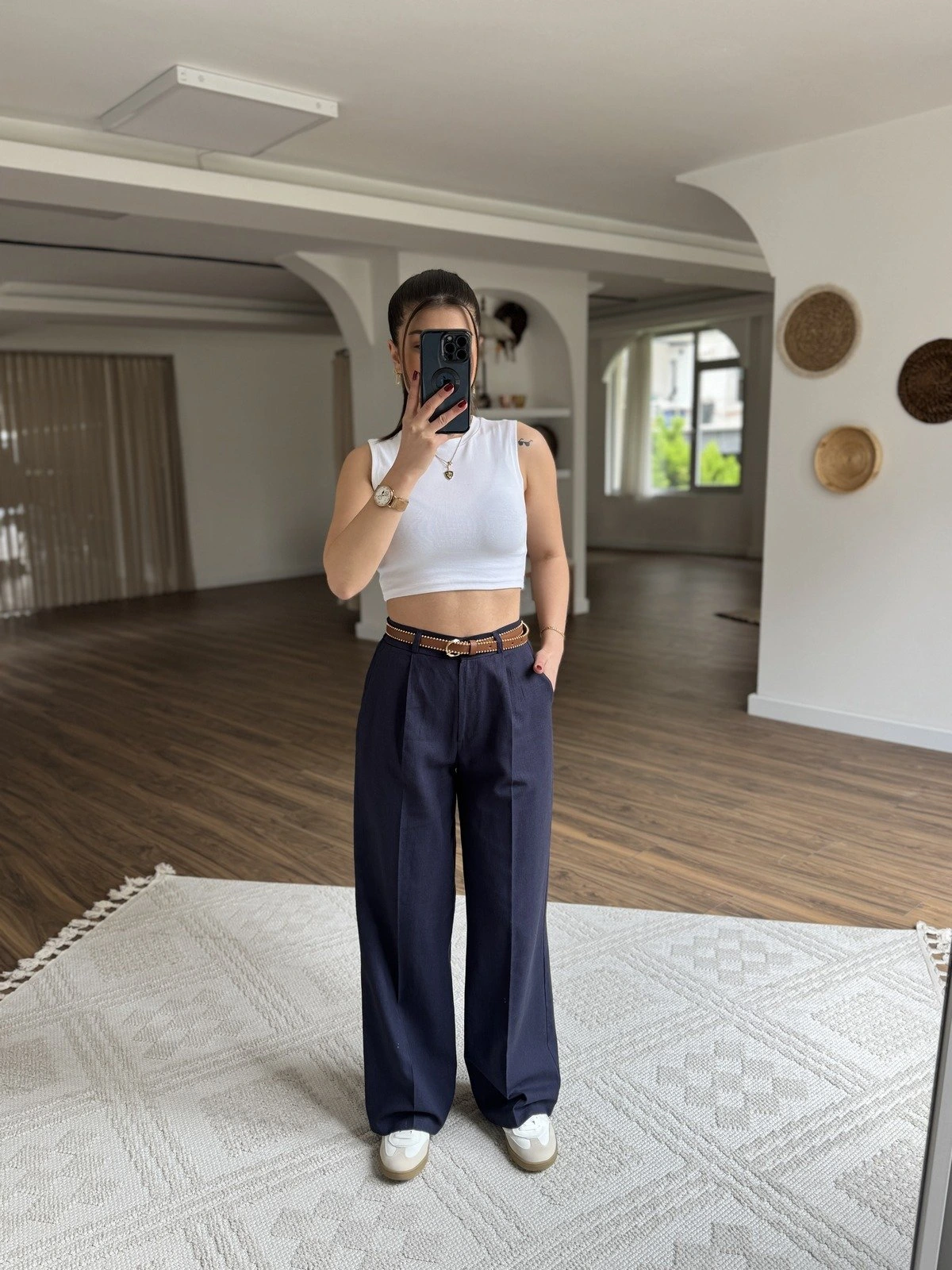 ARKA BEL LASTİK BOL PAÇA KETEN VİSKON PANTOLON – LACİVERT