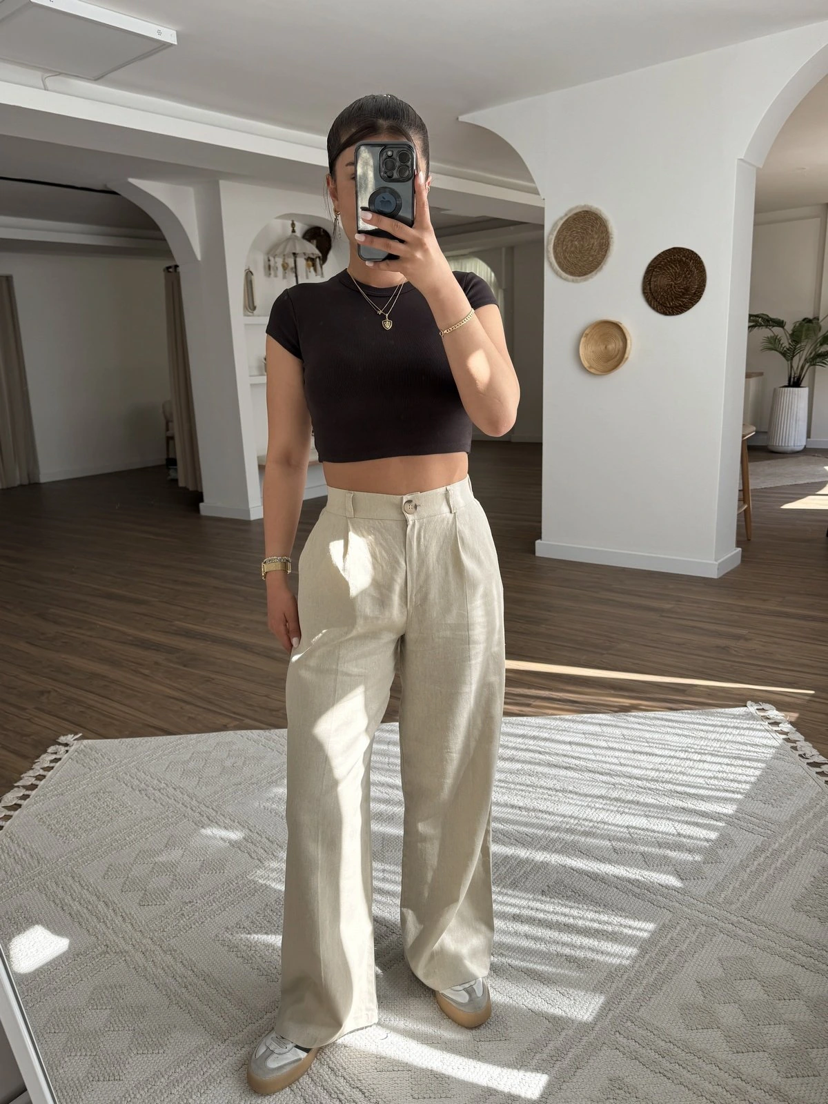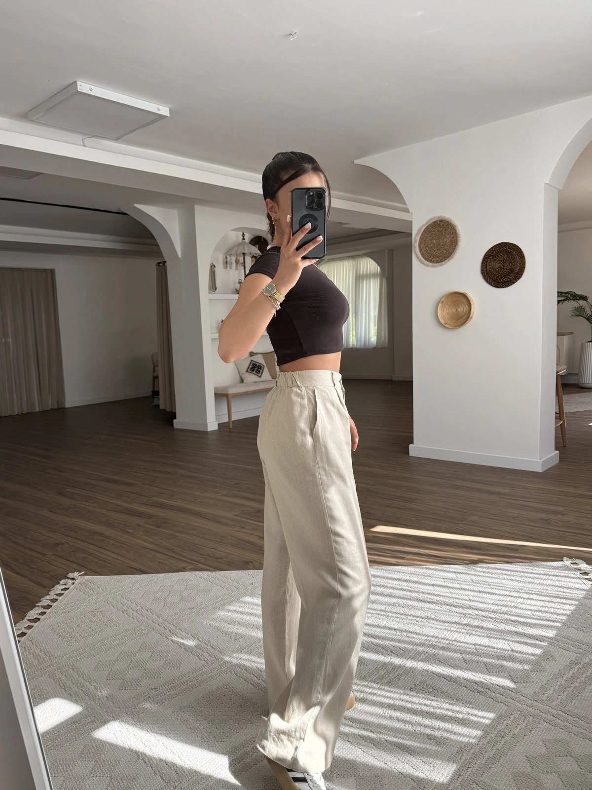 ARKA BEL LASTİK BOL PAÇA KETEN VİSKON PANTOLON – TAŞ