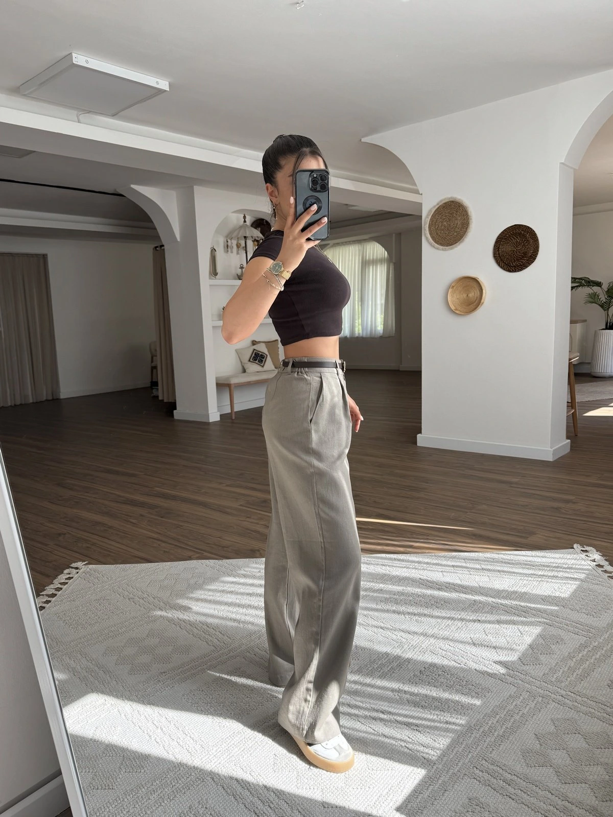 ARKA BEL LASTİK BOL PAÇA KETEN VİSKON PANTOLON – VİZON