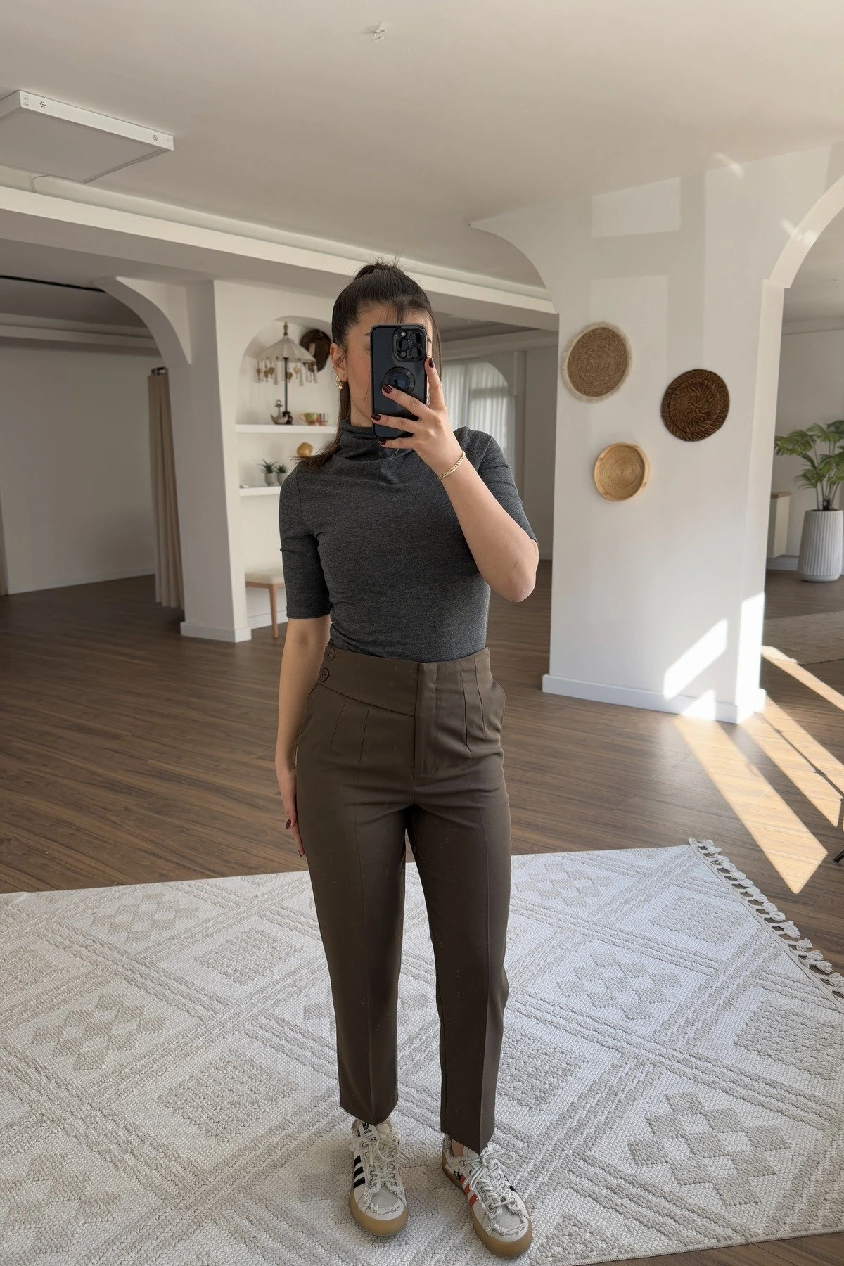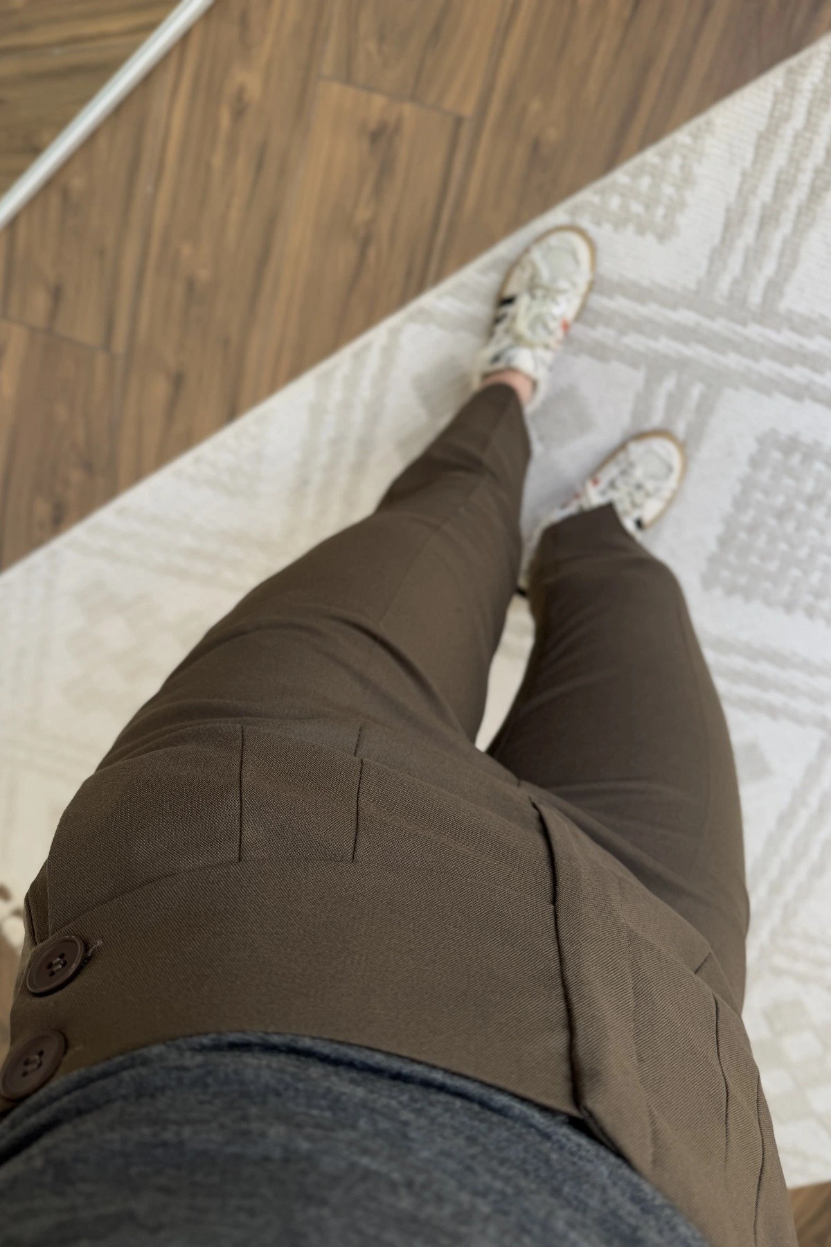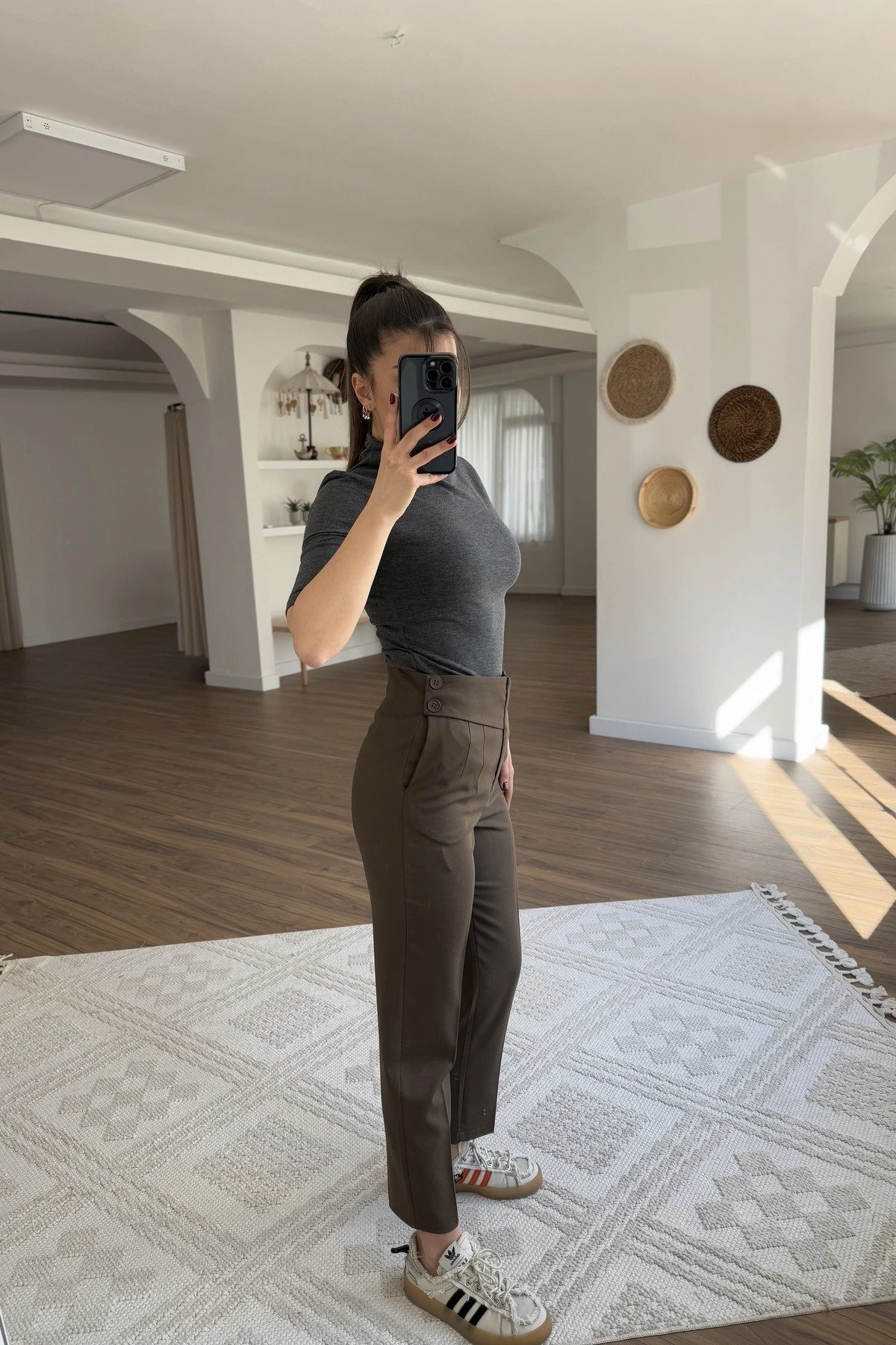 ARKA BEL V YAN DÜĞME DETAY VİSKON HAVUÇ PANTOLON – KAHVE