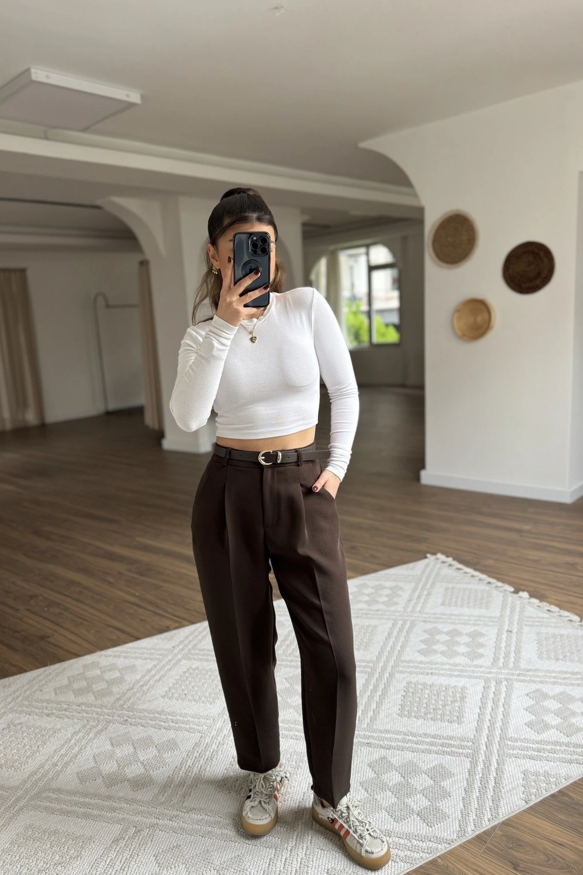 ARKA KAPAK CEP KEMERLİ KUMAŞ PANTOLON – KAHVE