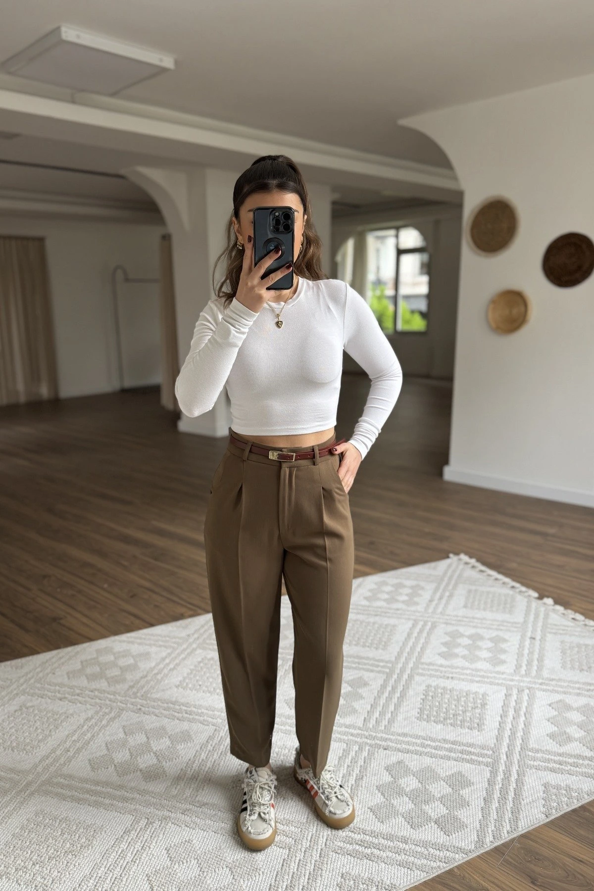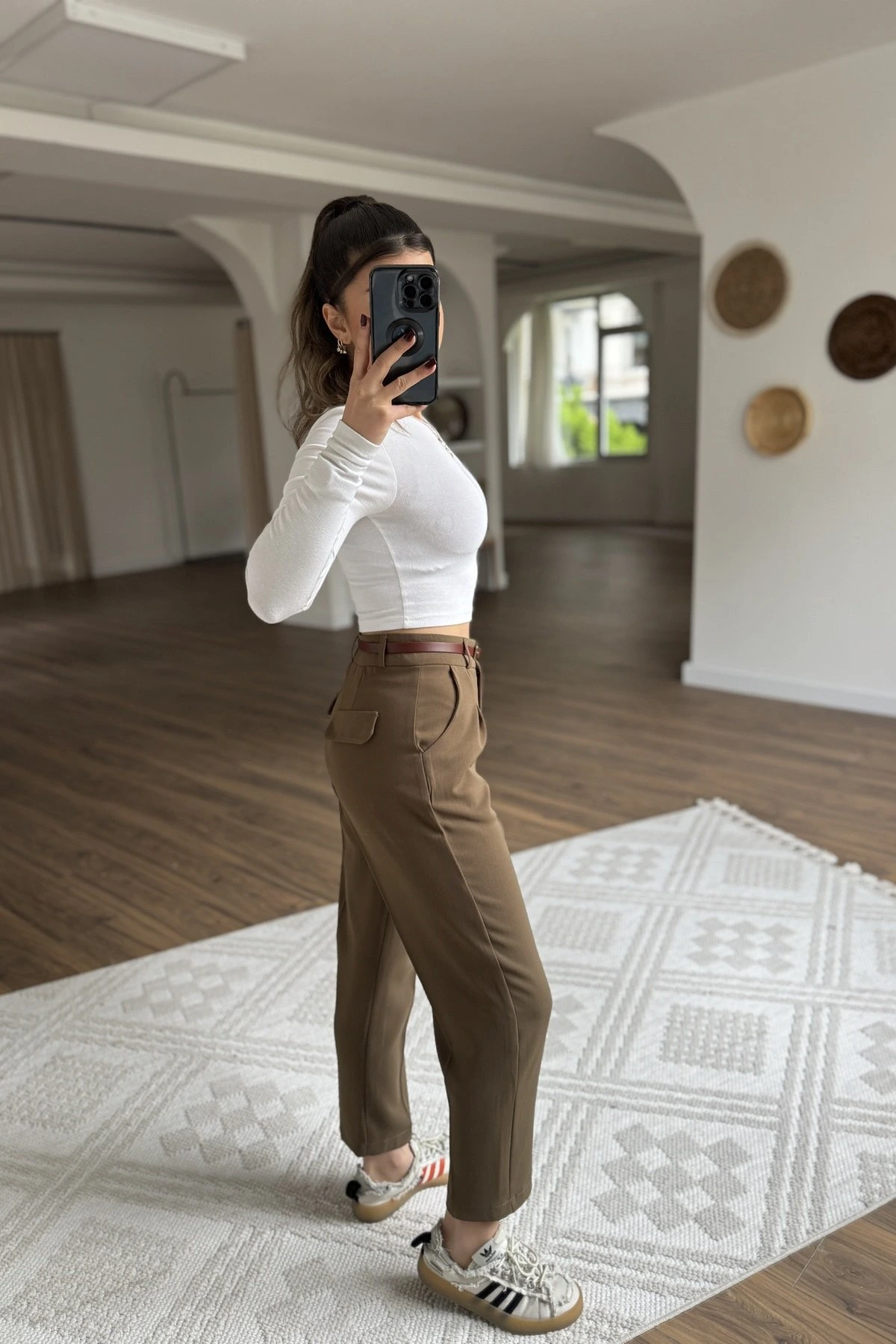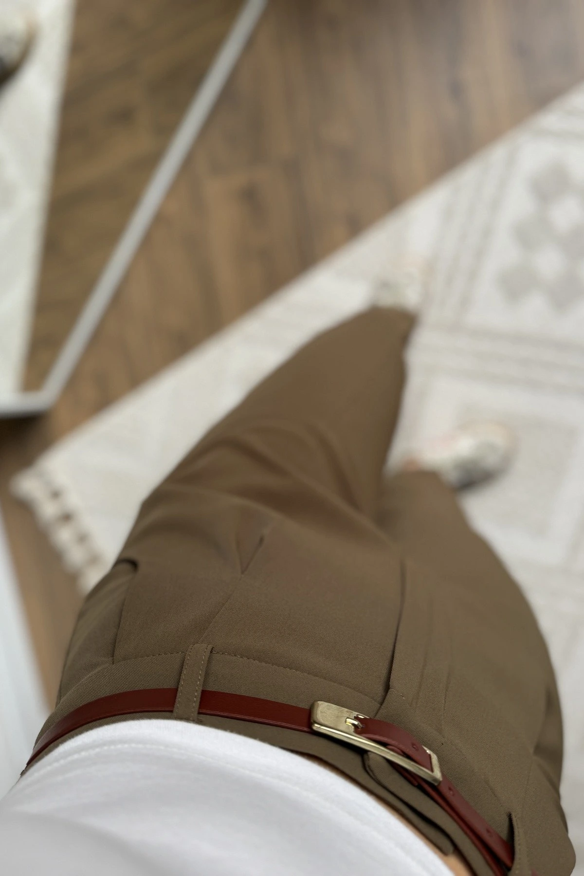ARKA KAPAK CEP KEMERLİ TİRİL KUMAŞ PANTOLON - KAHVE