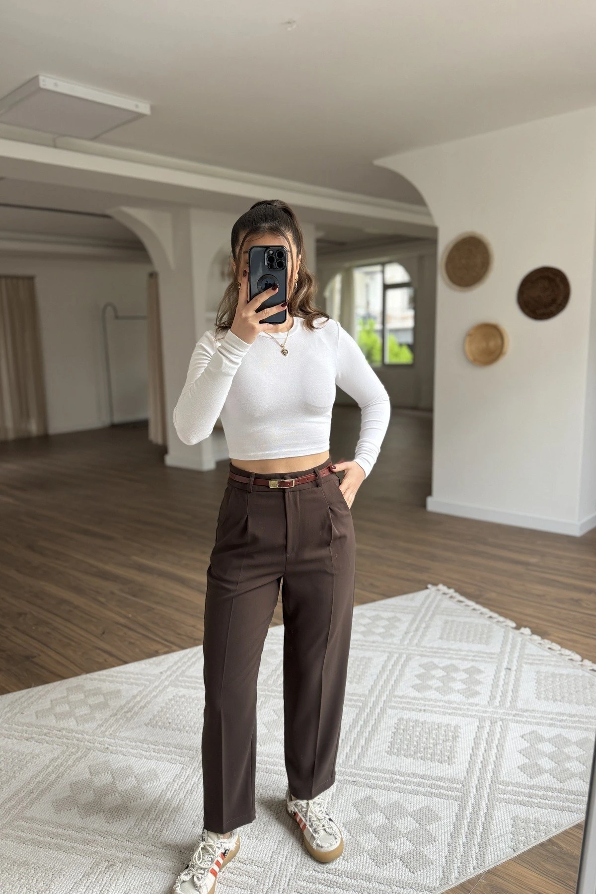 ARKA KAPAK CEP KEMERLİ TİRİL KUMAŞ PANTOLON – KAHVE