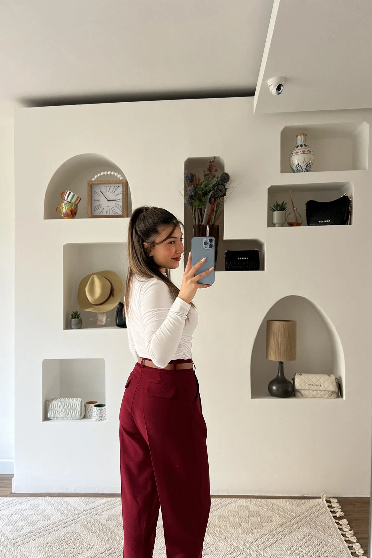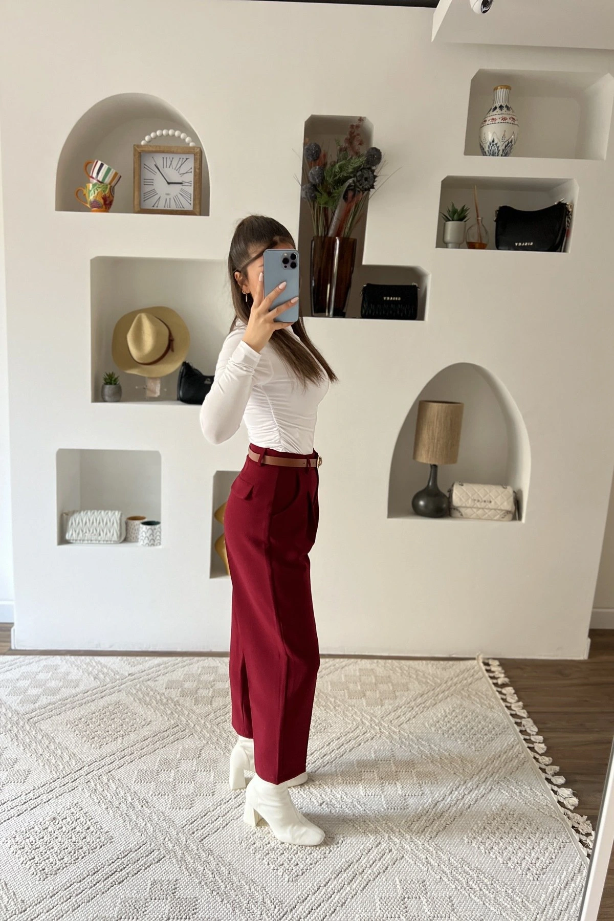 ARKA KAPAK CEP ÖN PİLİ KEMERLİ LİKRALI PANTOLON – BORDO