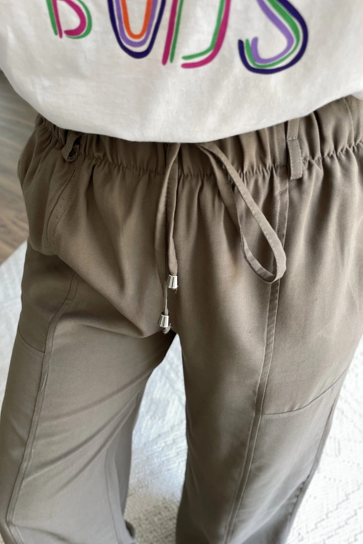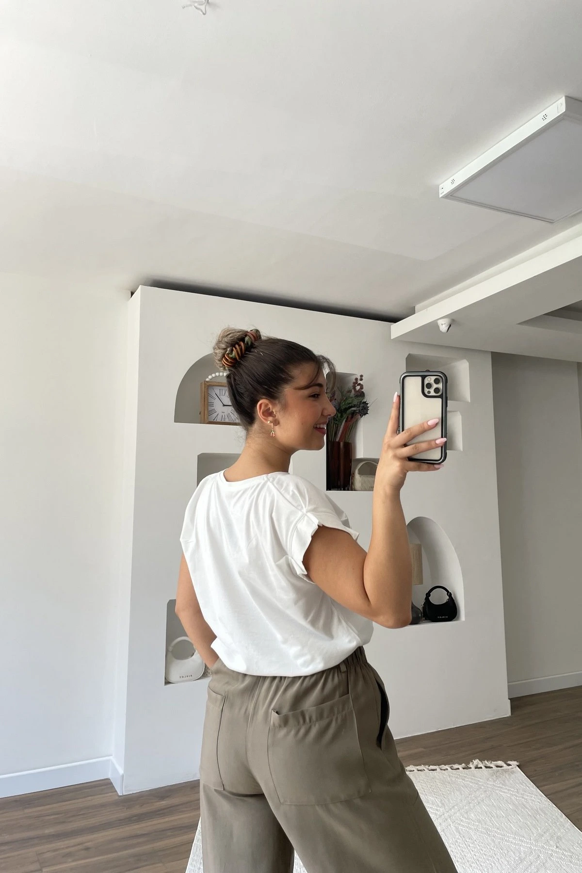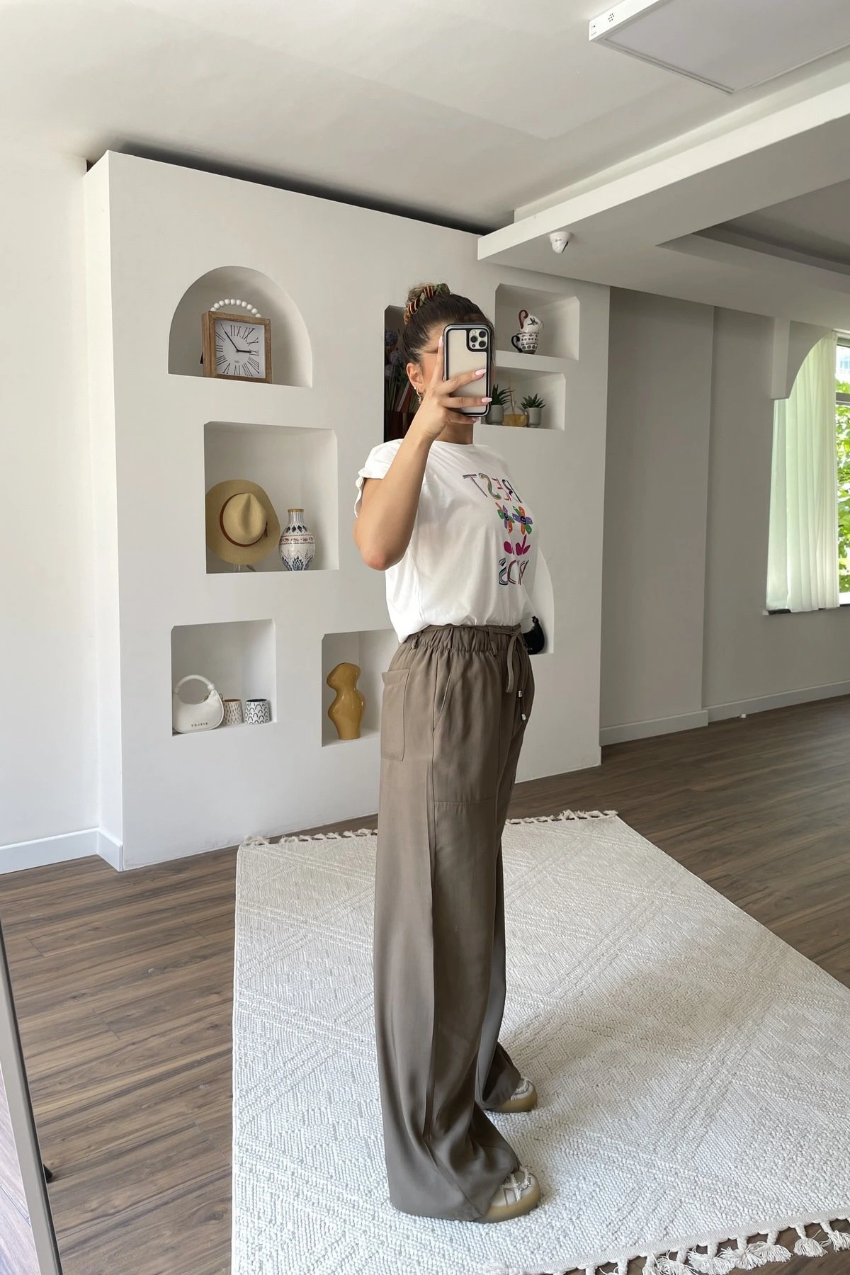 BEL LASTİK ARKA VE YAN CEPLİ DİKİŞ DETAY PAMUK TENCEL PANTOLON – HAKİ