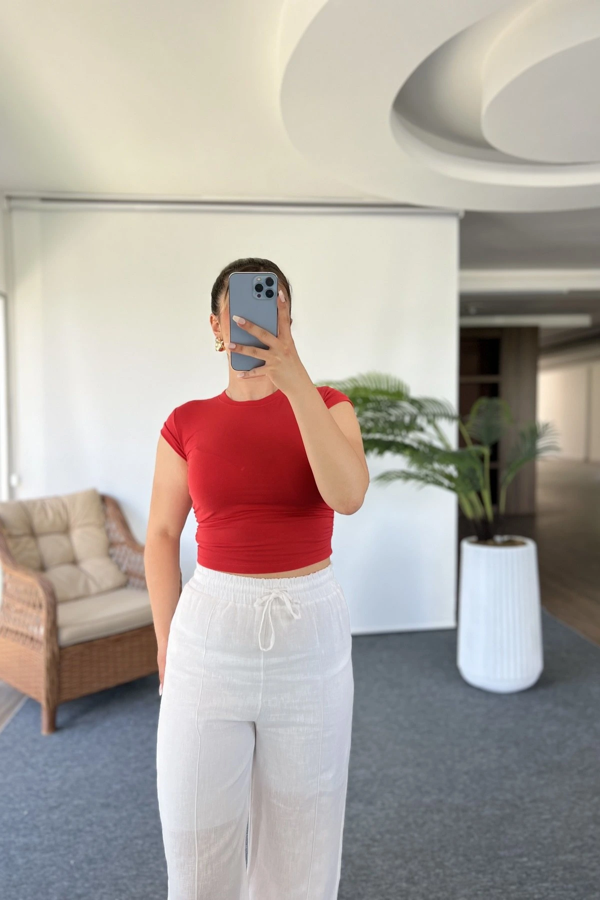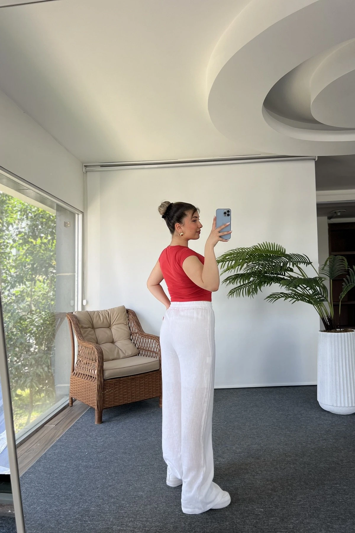 BEL LASTİK ASTARLI ÖN DİKİŞ KETEN PANTOLON – EKRU