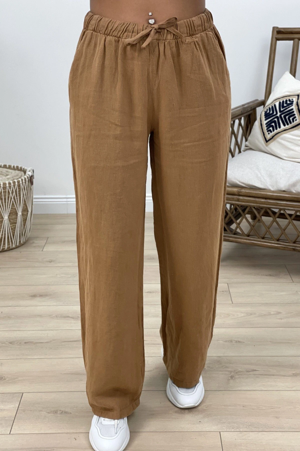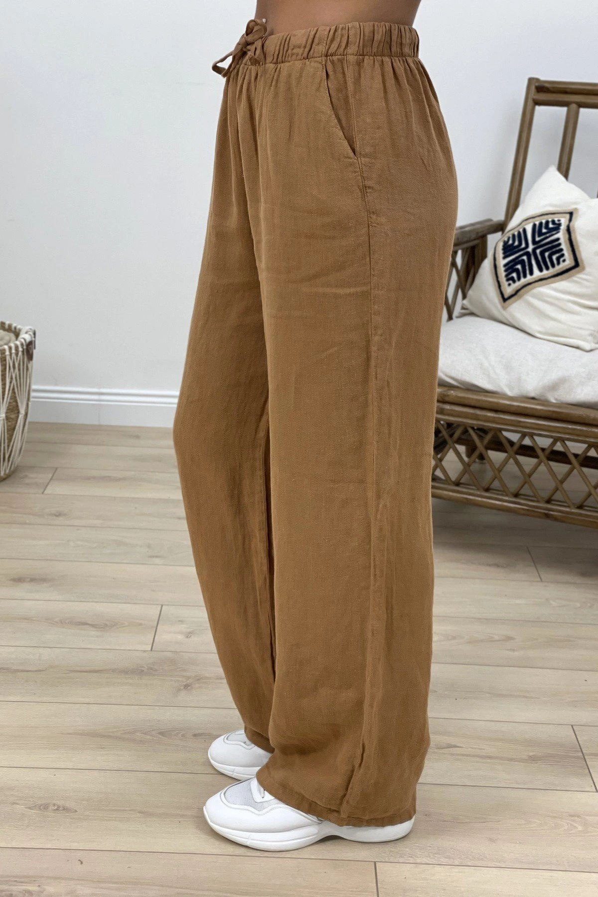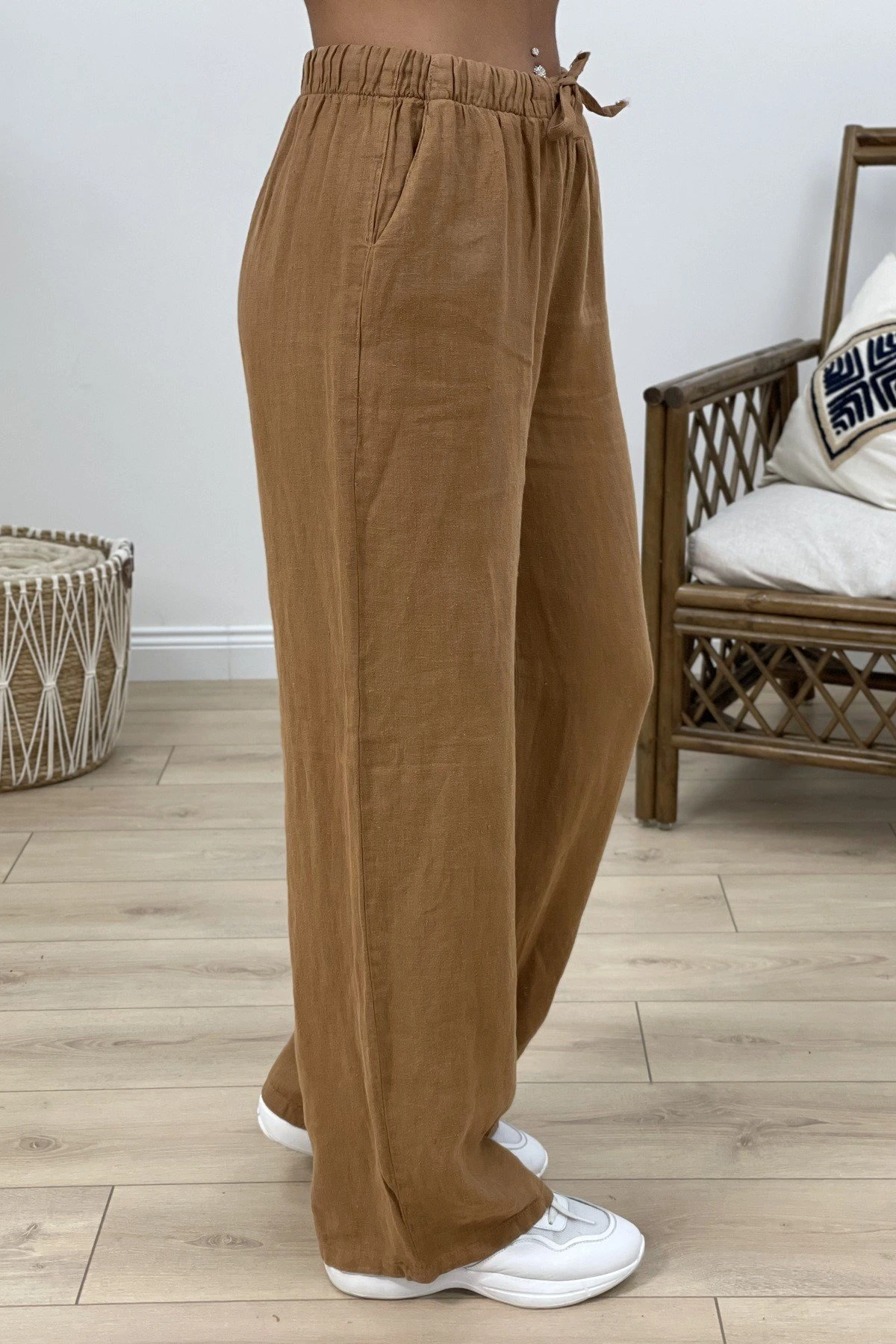 BEL LASTİK VE FERMUARLI KETEN PANTOLON - KAKAO