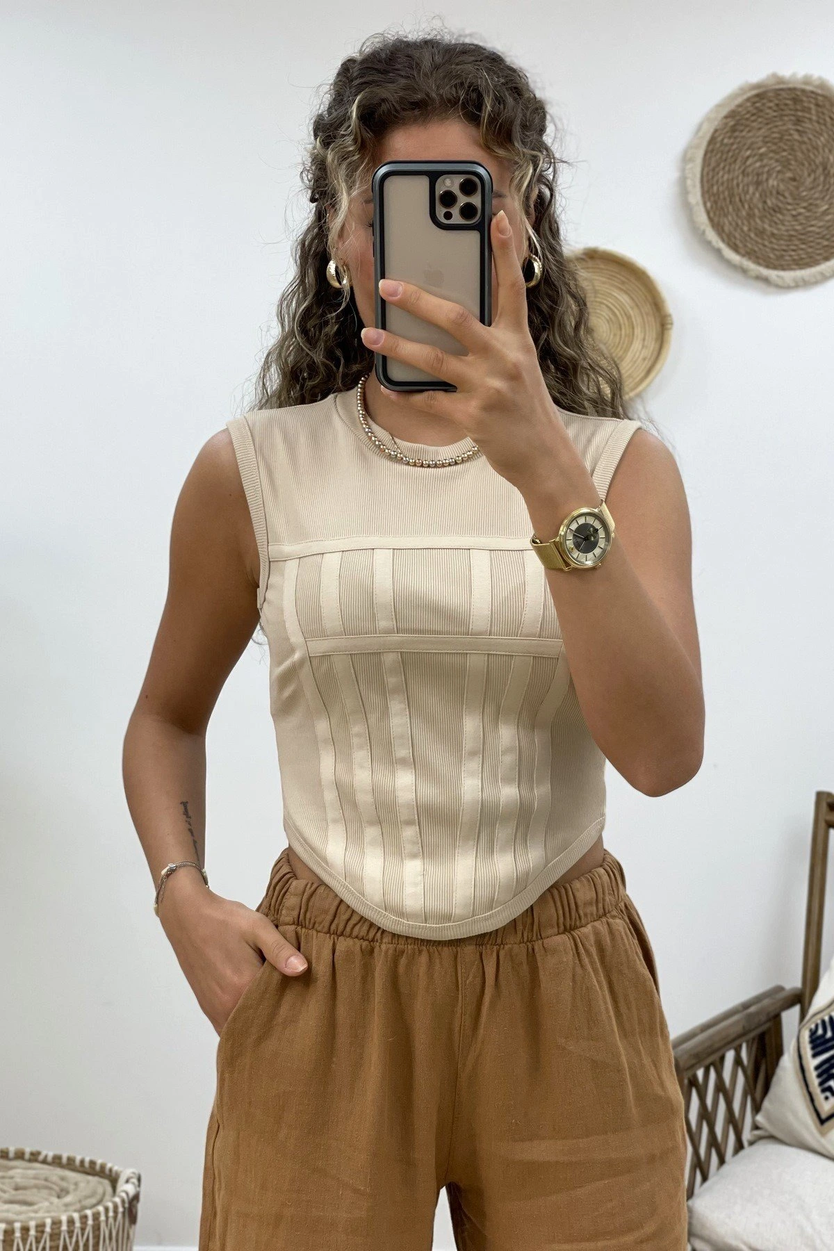BEL LASTİK BOL PAÇA KETEN RAHAT PANTOLON – AÇIK BEJ