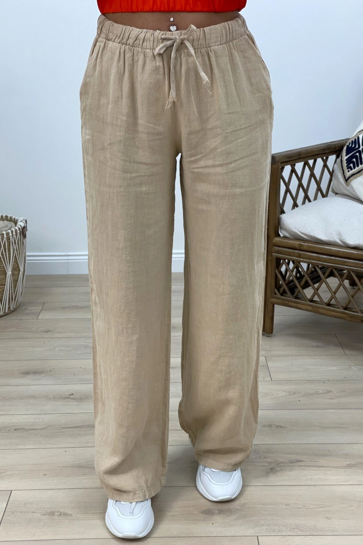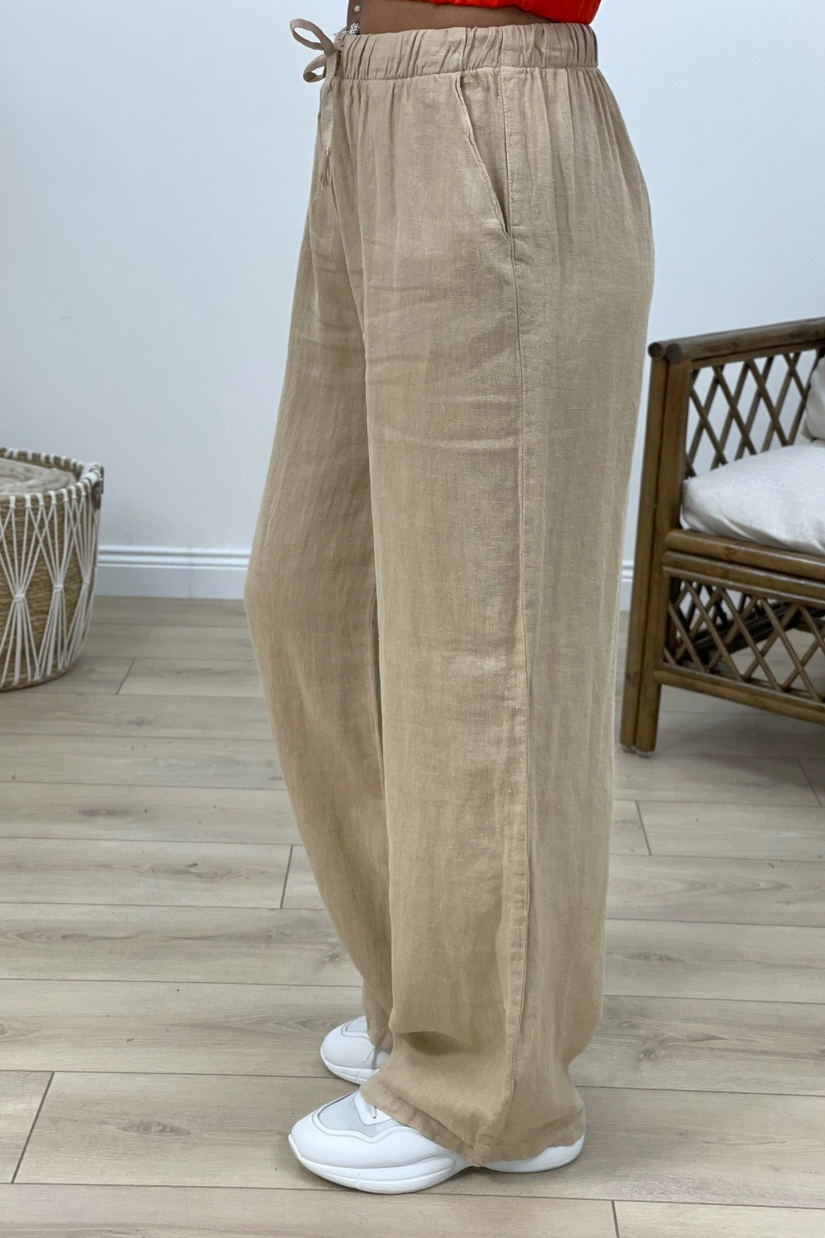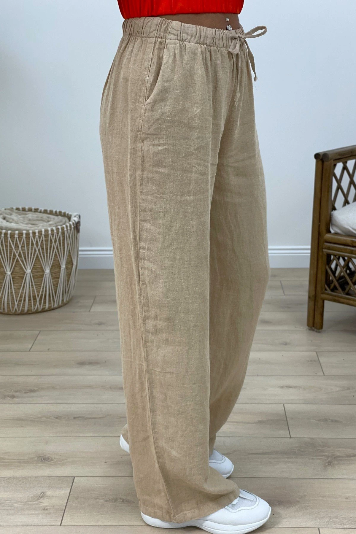 BEL LASTİK BOL PAÇA KETEN RAHAT PANTOLON – BEJ