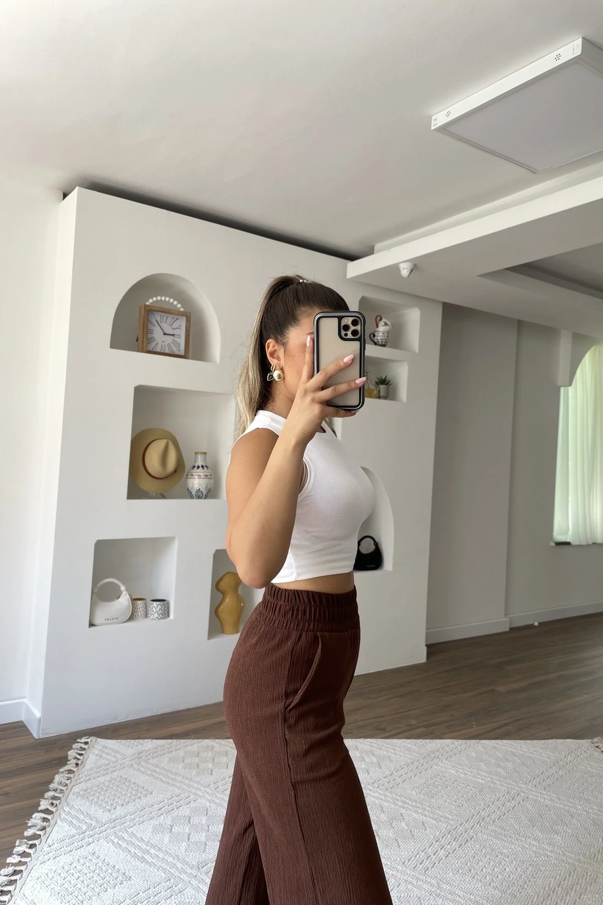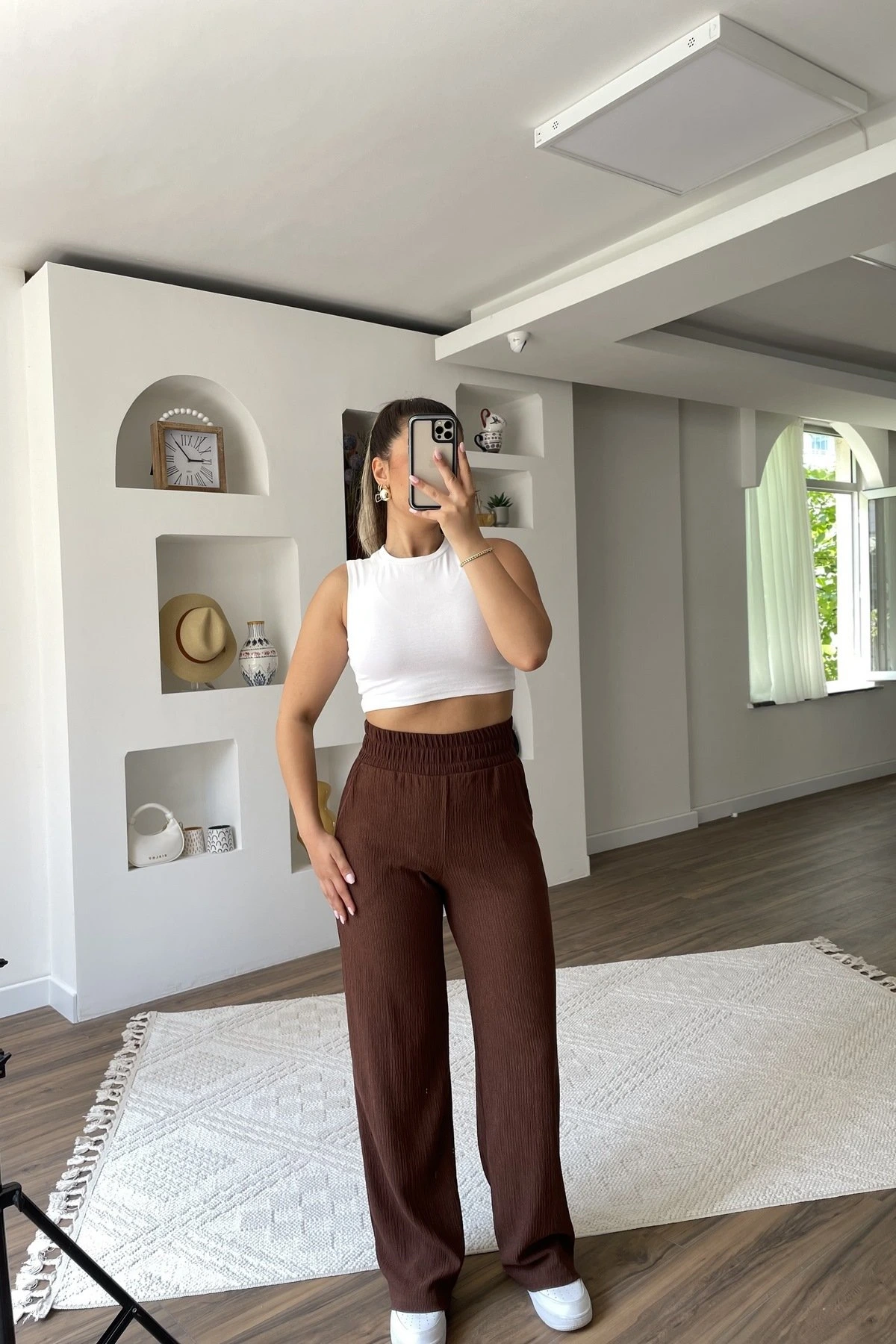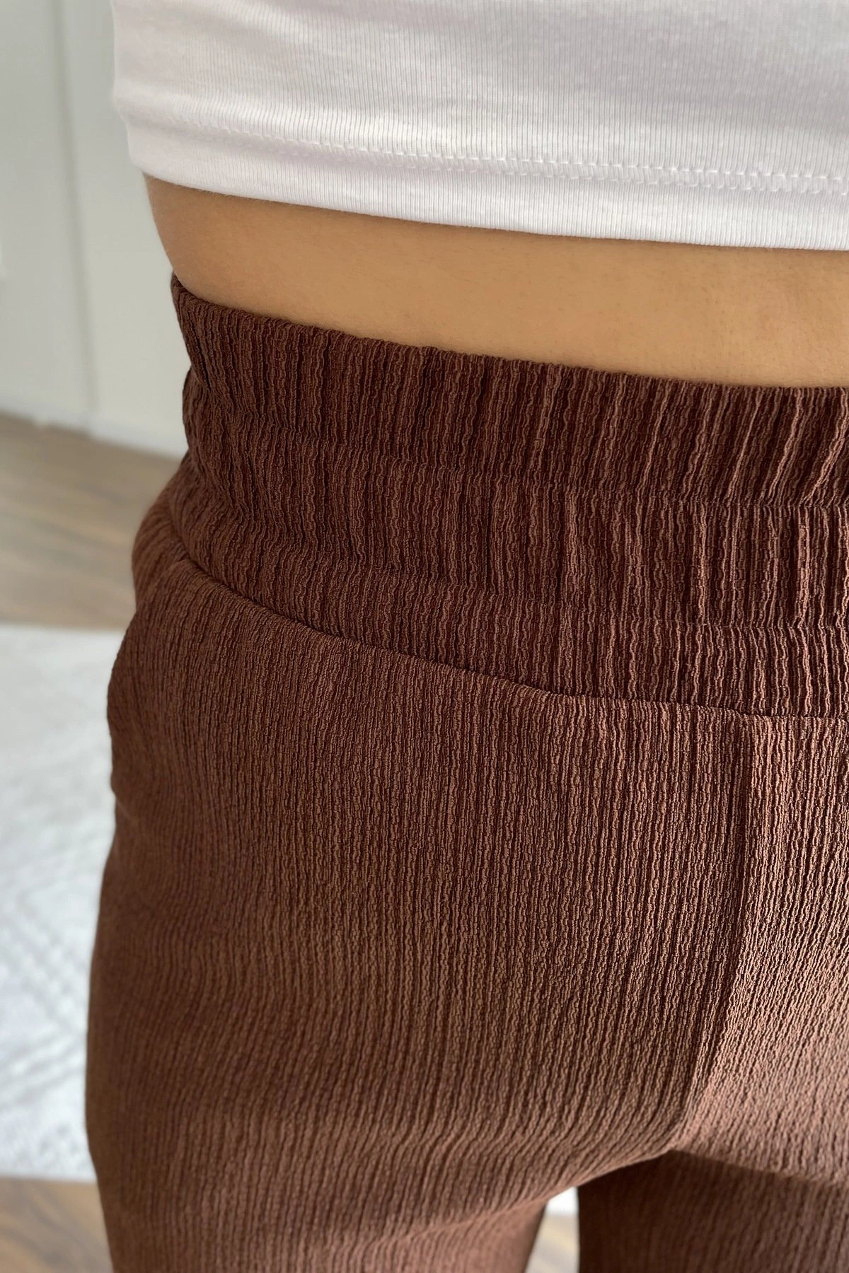 BEL LASTİK BÜRÜMCÜK CEPLİ BOL PAÇA PANTOLON – KAHVE