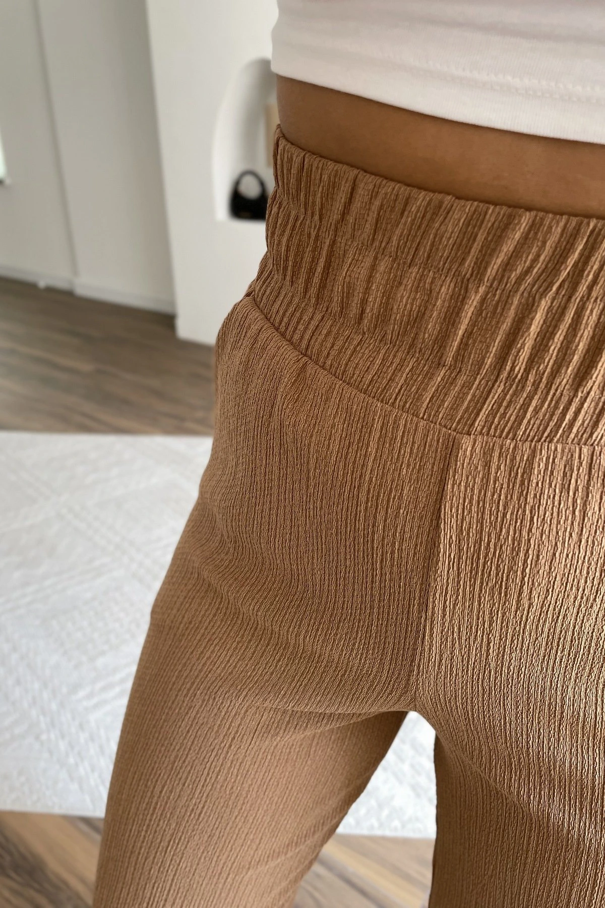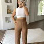 BEL LASTİK BÜRÜMCÜK CEPLİ BOL PAÇA PANTOLON – TABA