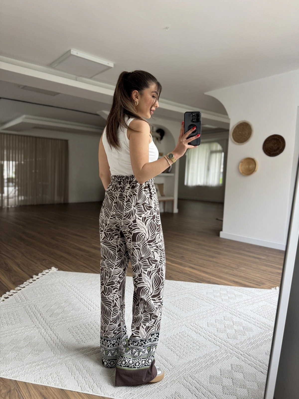 BEL LASTİK CEPLİ DESENLİ VİSKON PANTOLON – BEJ- KAHVE