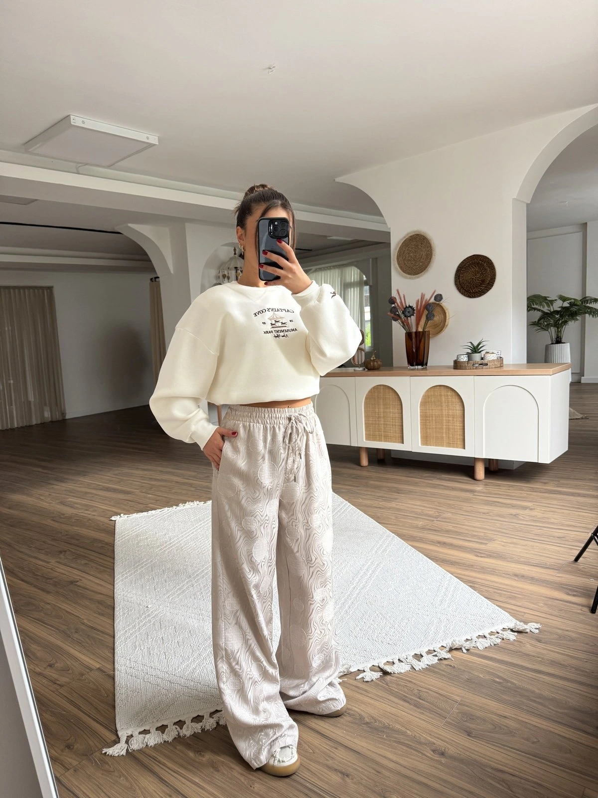 BEL LASTİK CEPLİ DOKU DESEN VİSKON RAHAT PANTOLON – TAŞ