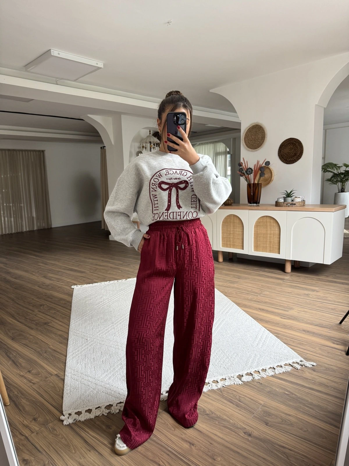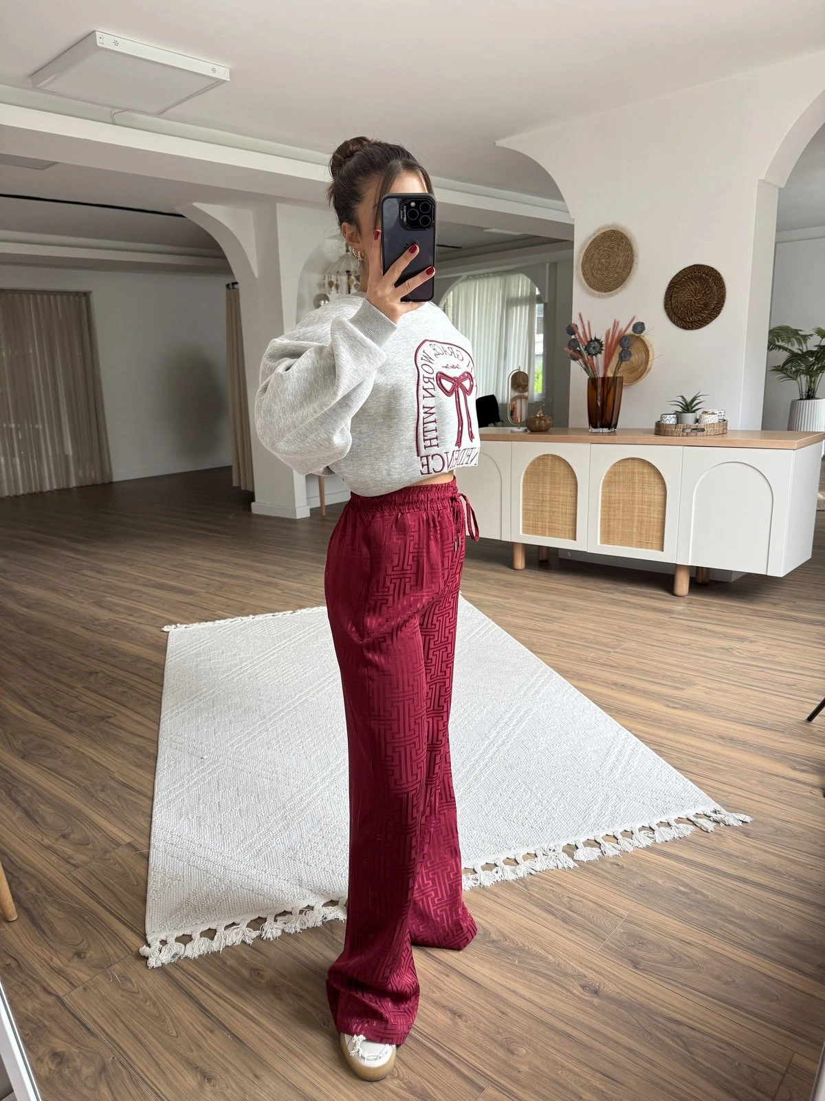BEL LASTİK CEPLİ JAKARLI VİSKON RAHAT PANTOLON – BORDO