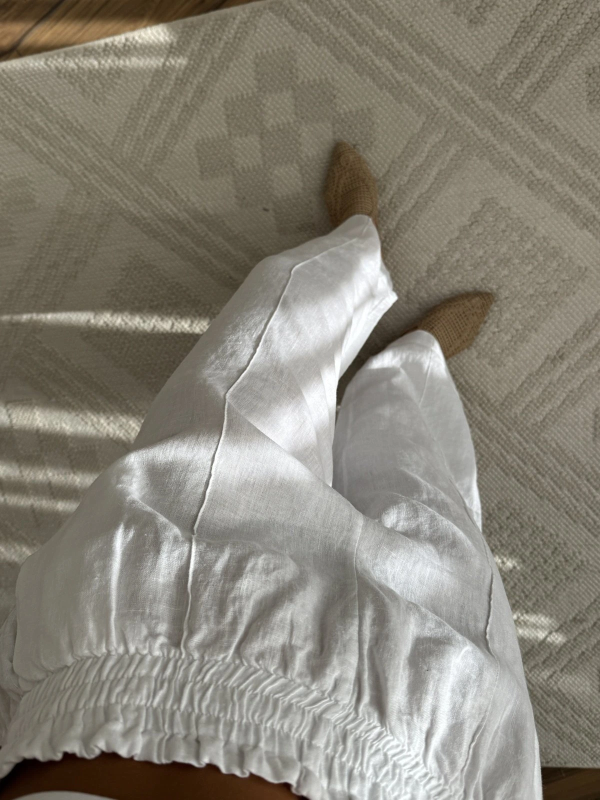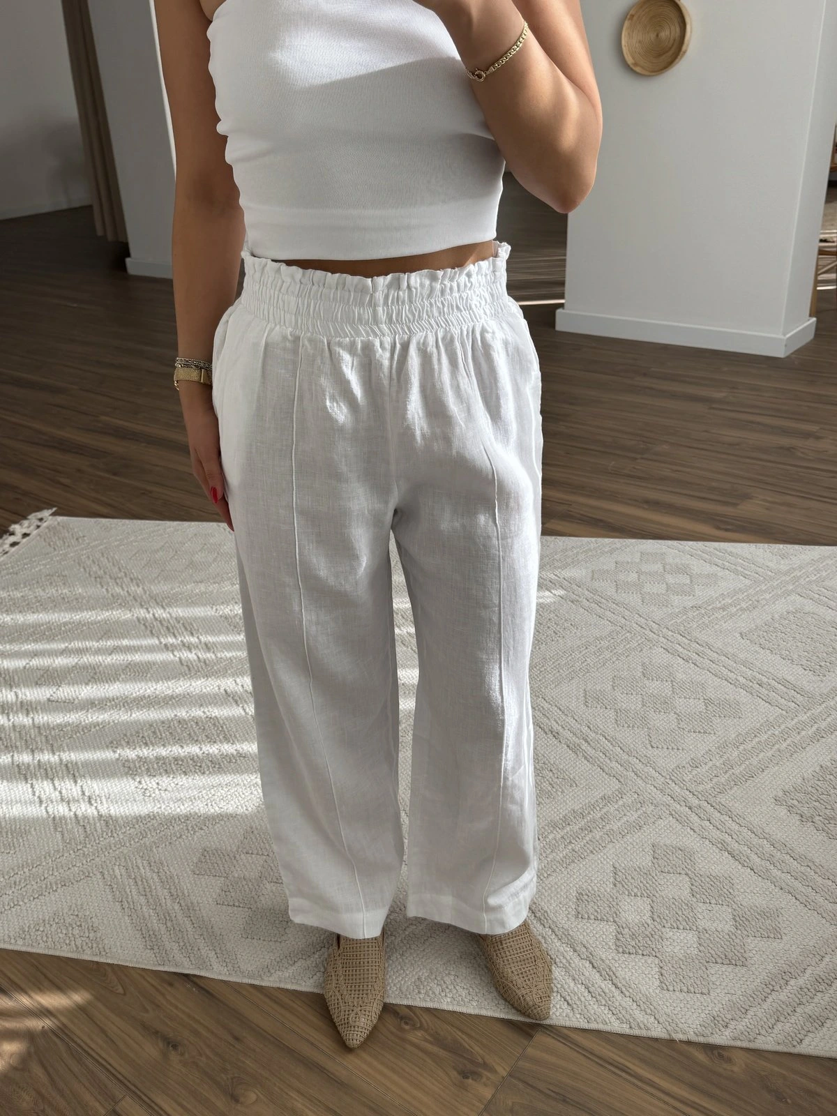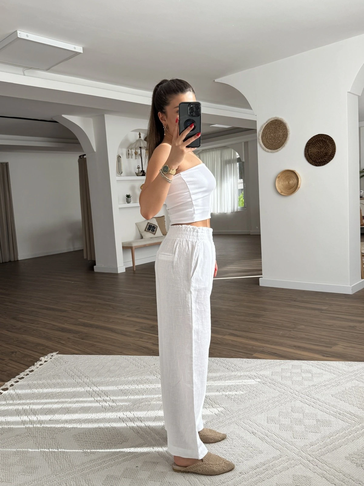 BEL LASTİK CEPLİ ÖN DİKİŞ HAM KETEN PANTOLON – BEYAZ