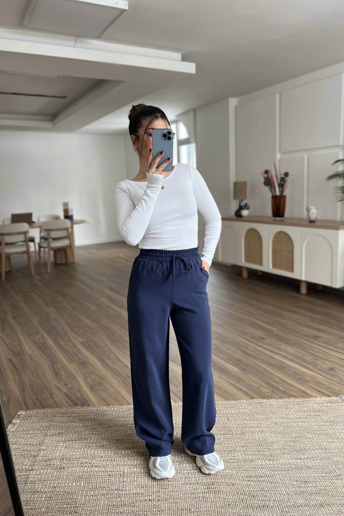 BEL LASTİK CEPLİ PAMUK TENSEL PANTOLON – LACİVERT