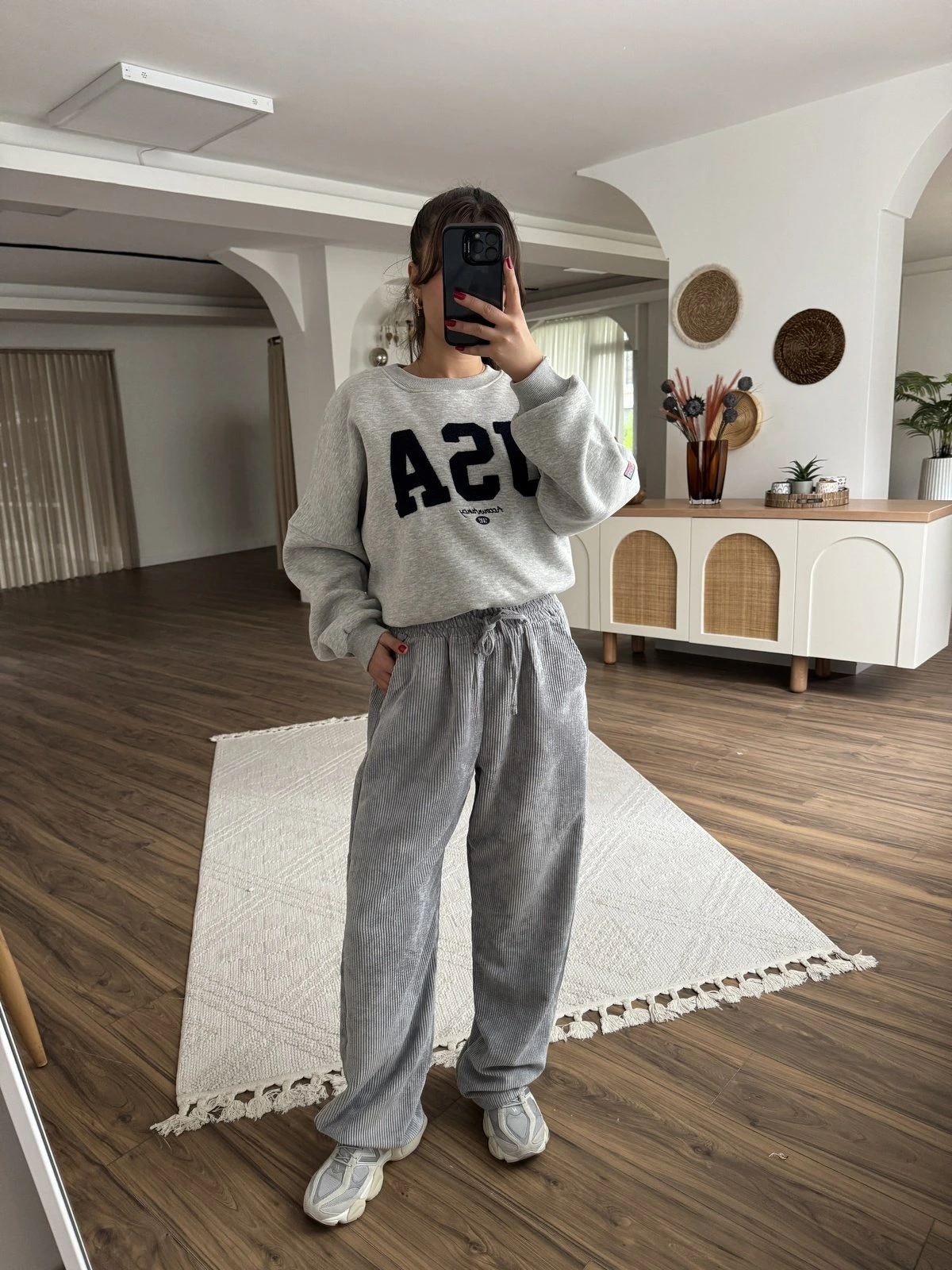 BEL LASTİK FİTİLLİ KADİFE CEPLİ PANTOLON – GRİ
