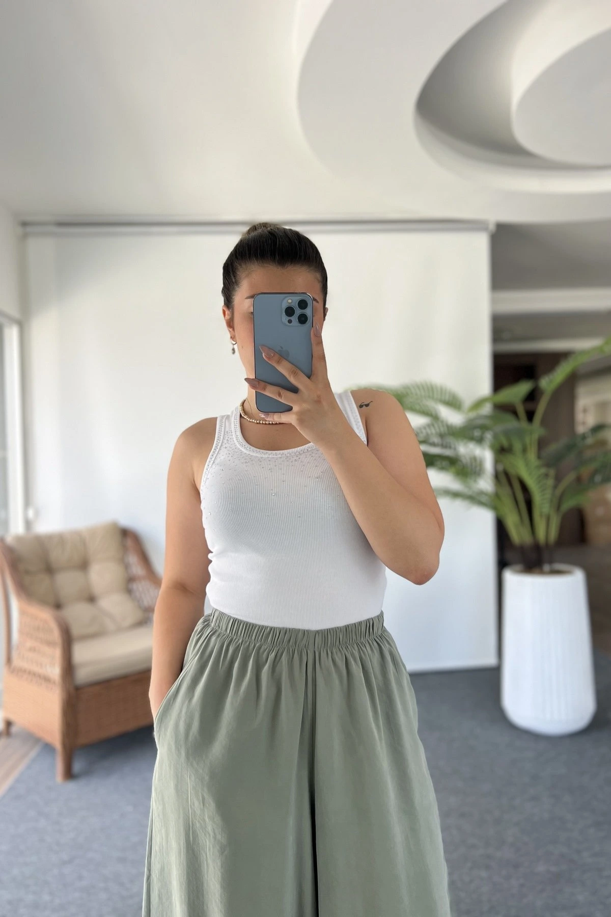 BEL LASTİK GENİŞ PAÇA CEPLİ MODAL PANTOLON – ÇAĞLA YEŞİLİ