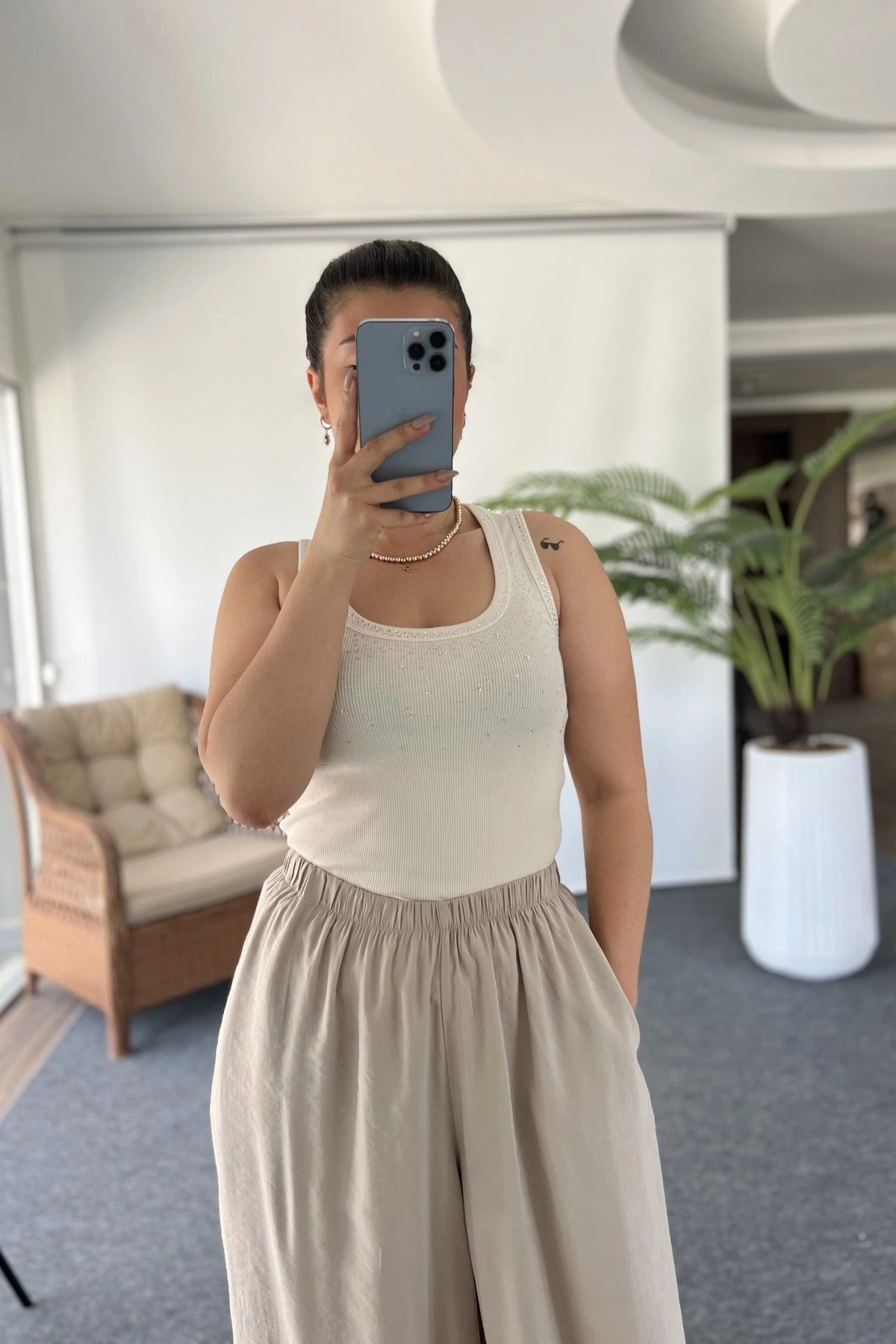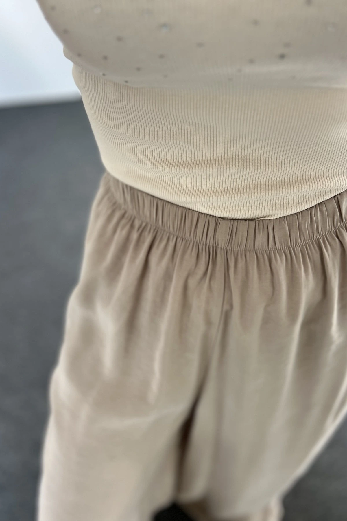 BEL LASTİK GENİŞ PAÇA CEPLİ MODAL PANTOLON – VİZON