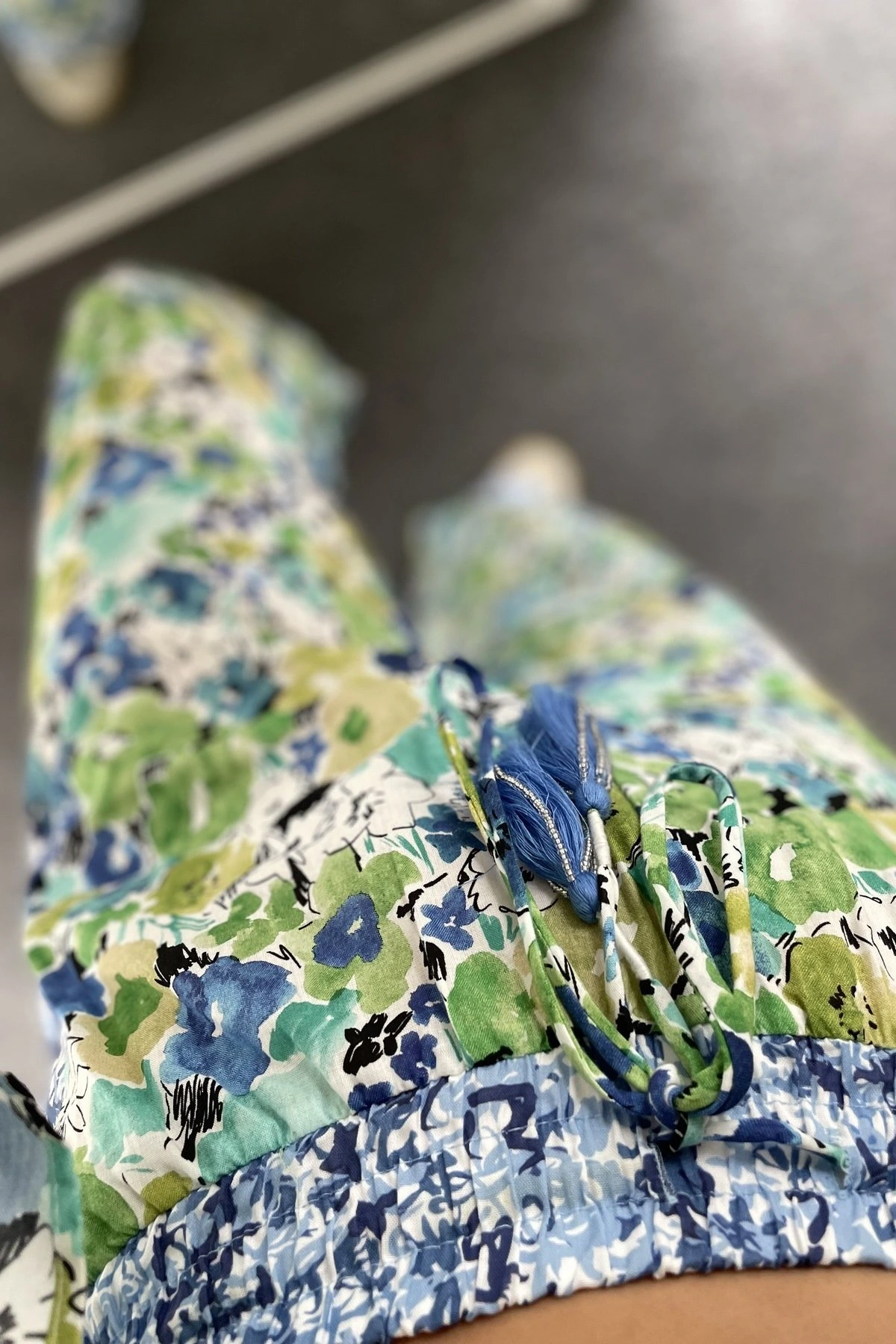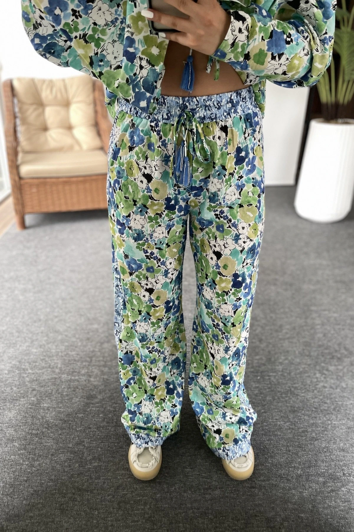 BEL LASTİK PÜSKÜL BAĞCIK DESENLİ PAMUK PANTOLON – YEŞİL