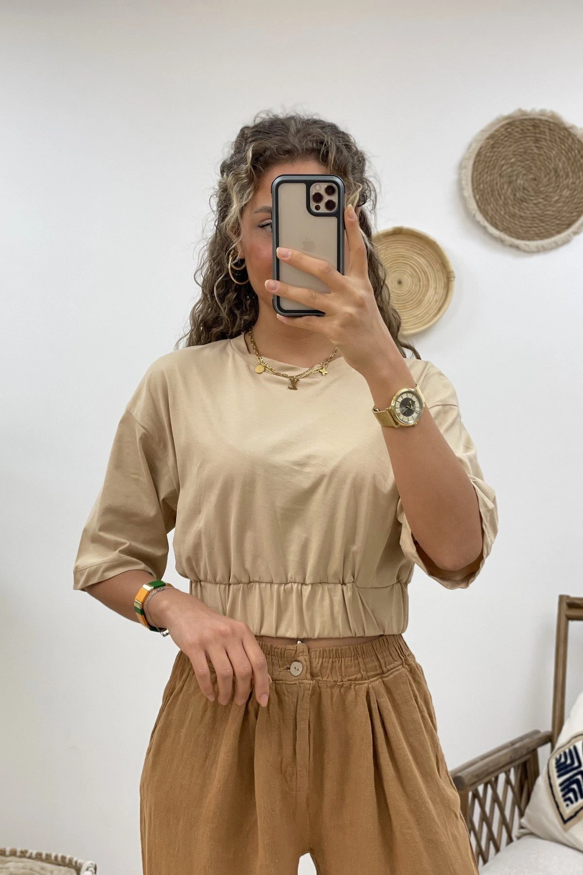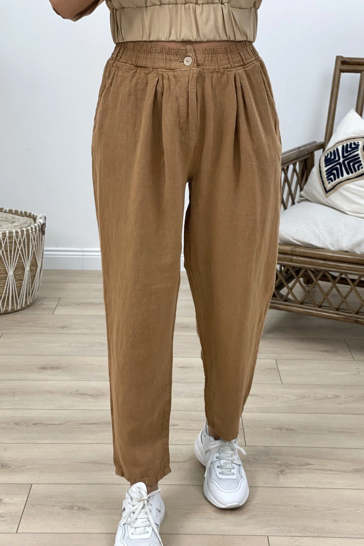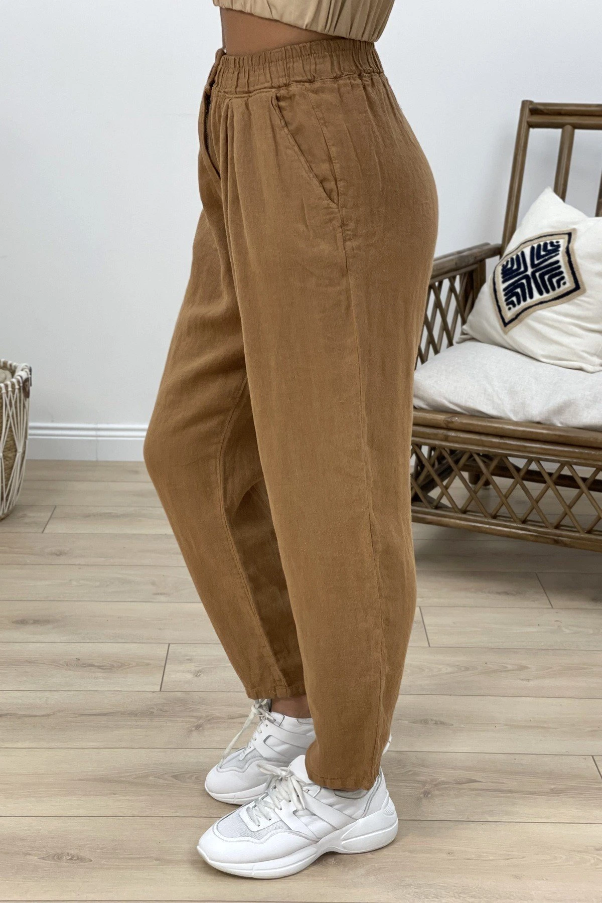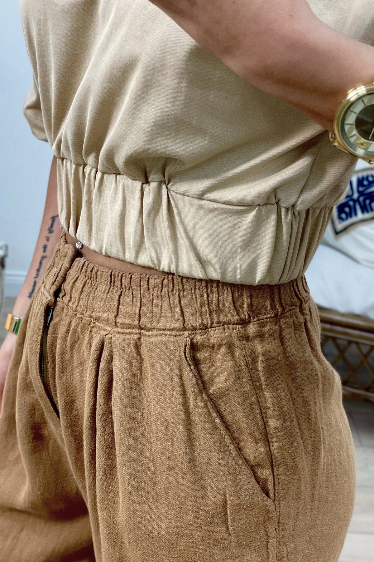 BEL LASTİK VE FERMUARLI KETEN PANTOLON – AÇIK KAHVE