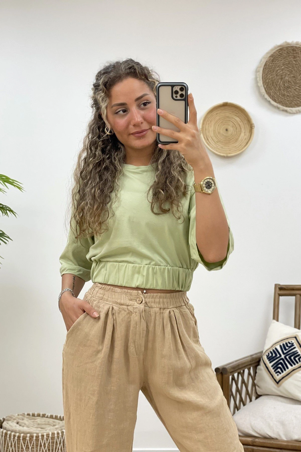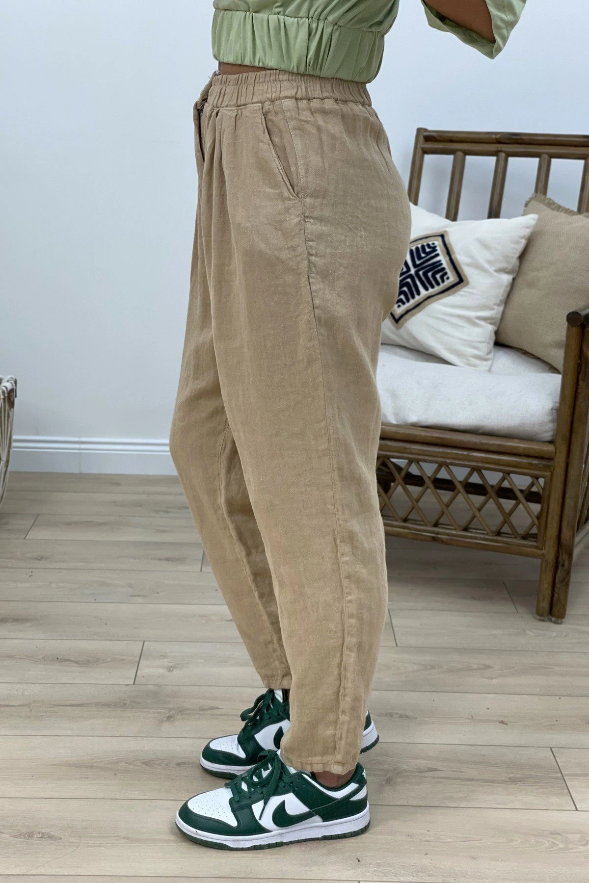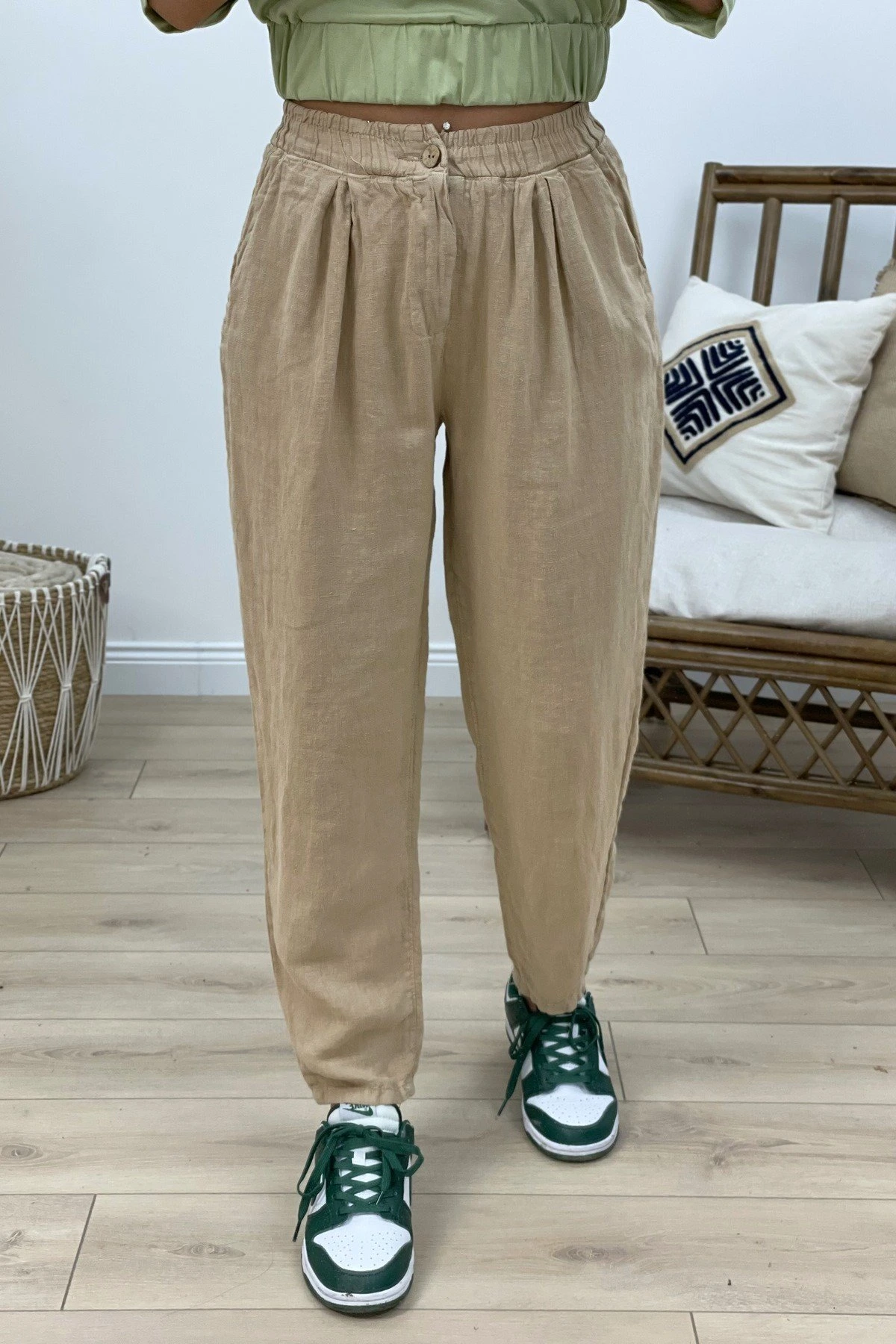 BEL LASTİK VE FERMUARLI KETEN PANTOLON - AÇIK KAHVE