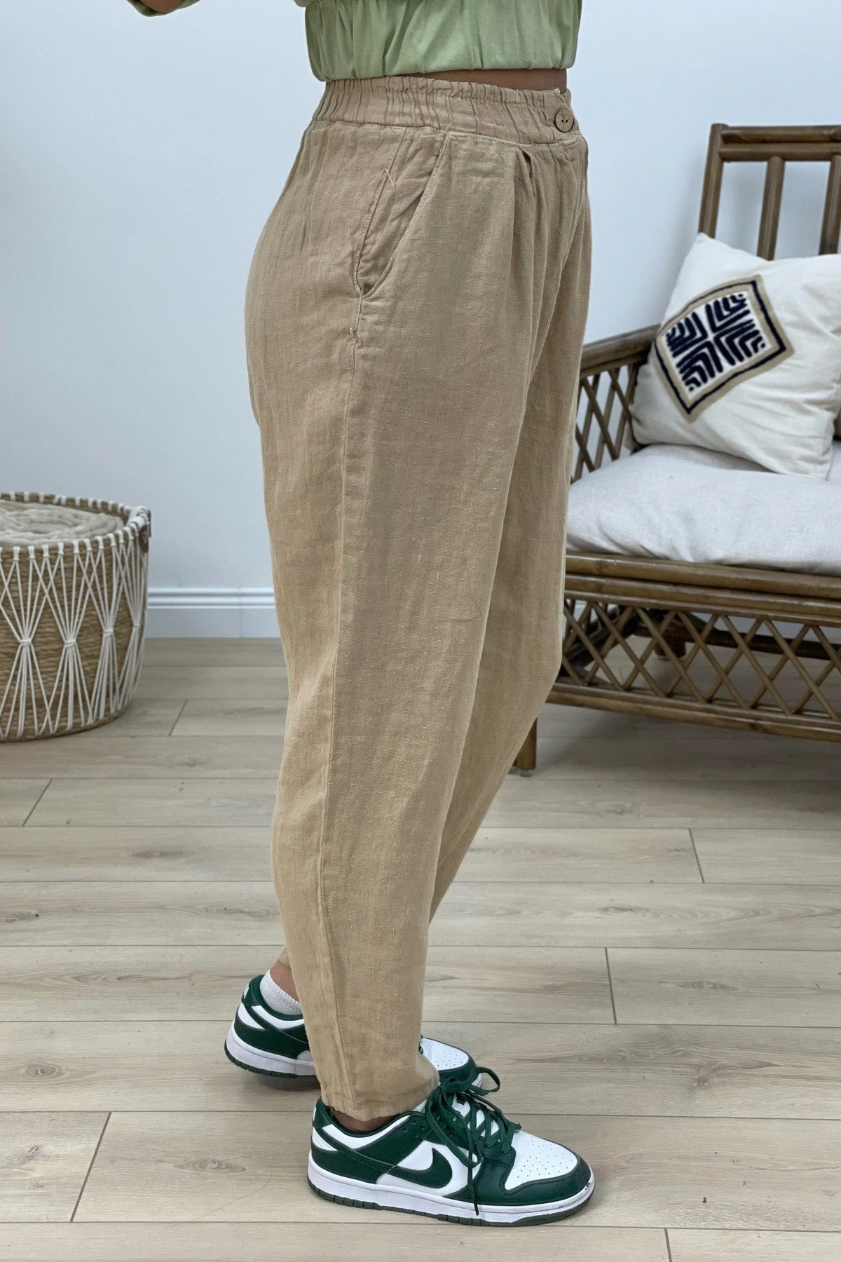 BEL LASTİK VE FERMUARLI KETEN PANTOLON – BEJ