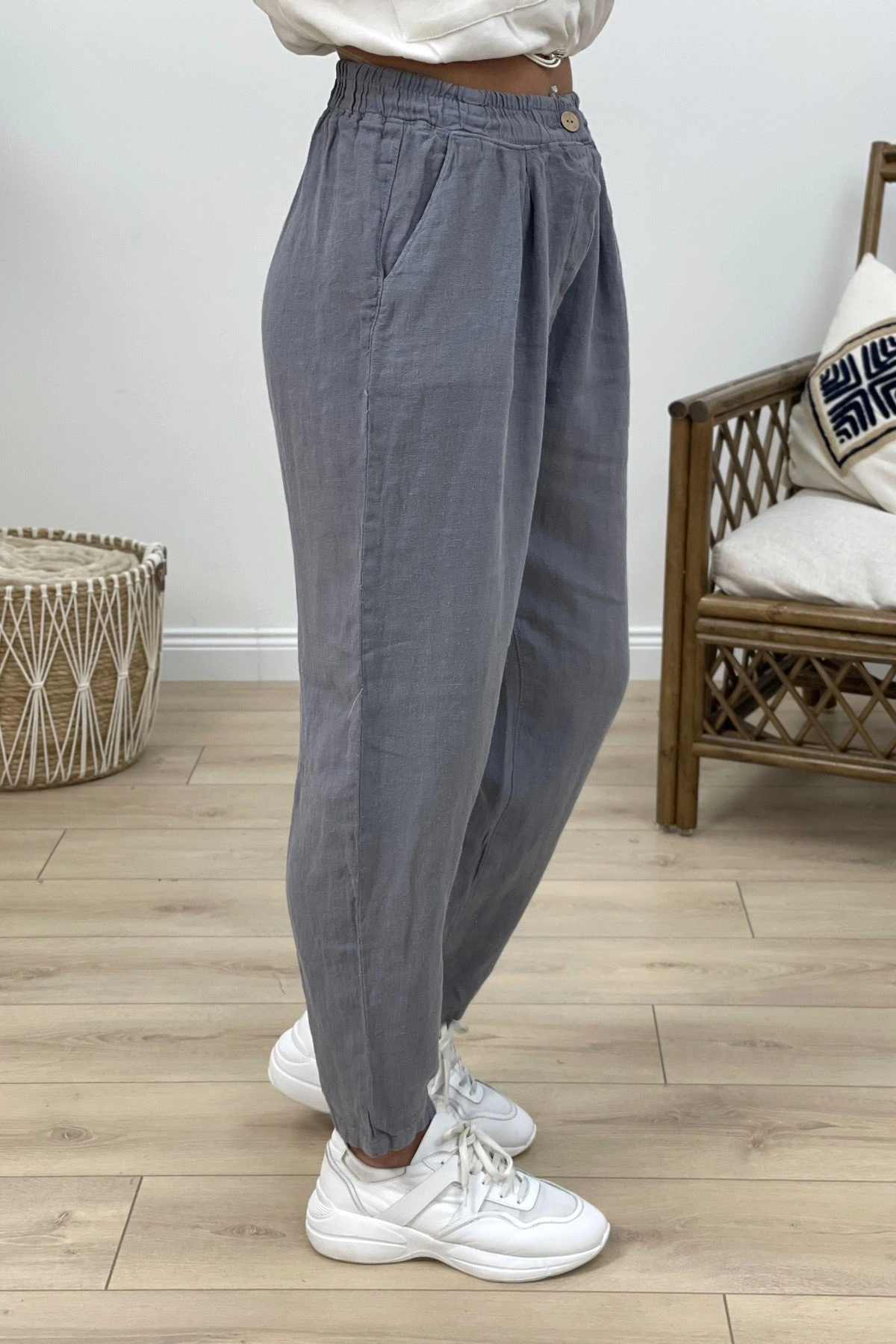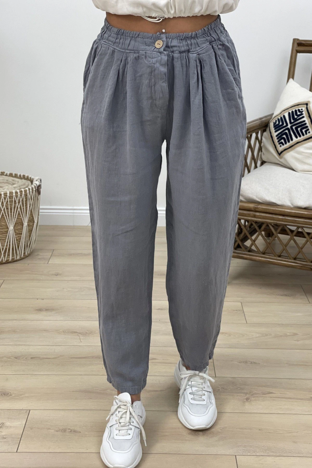 BEL LASTİK VE FERMUARLI KETEN PANTOLON – GRİ