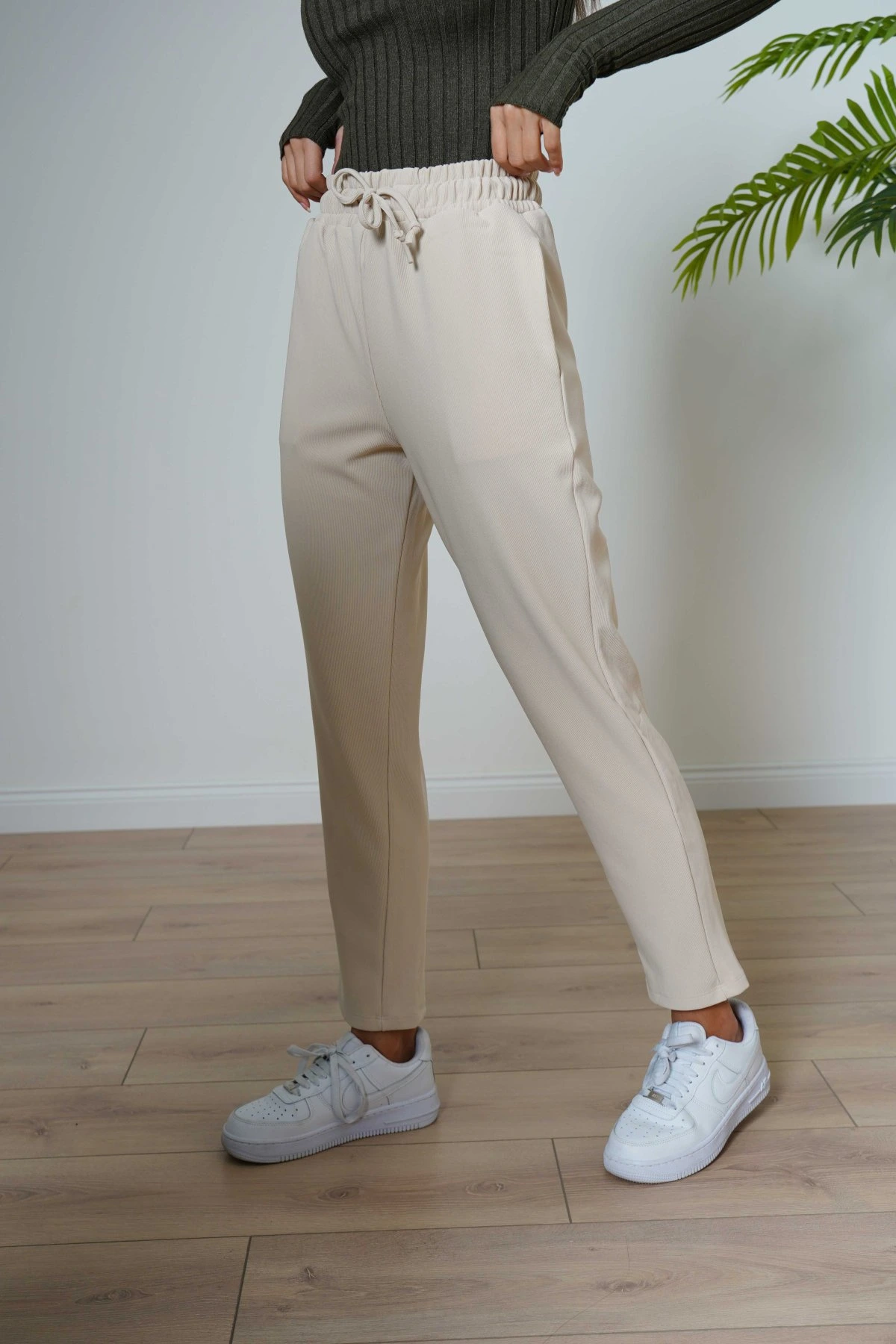 BEL LASTİKLİ CEPLİ İNCE FİTİLLİ RAHAT PANTOLON – TAŞ