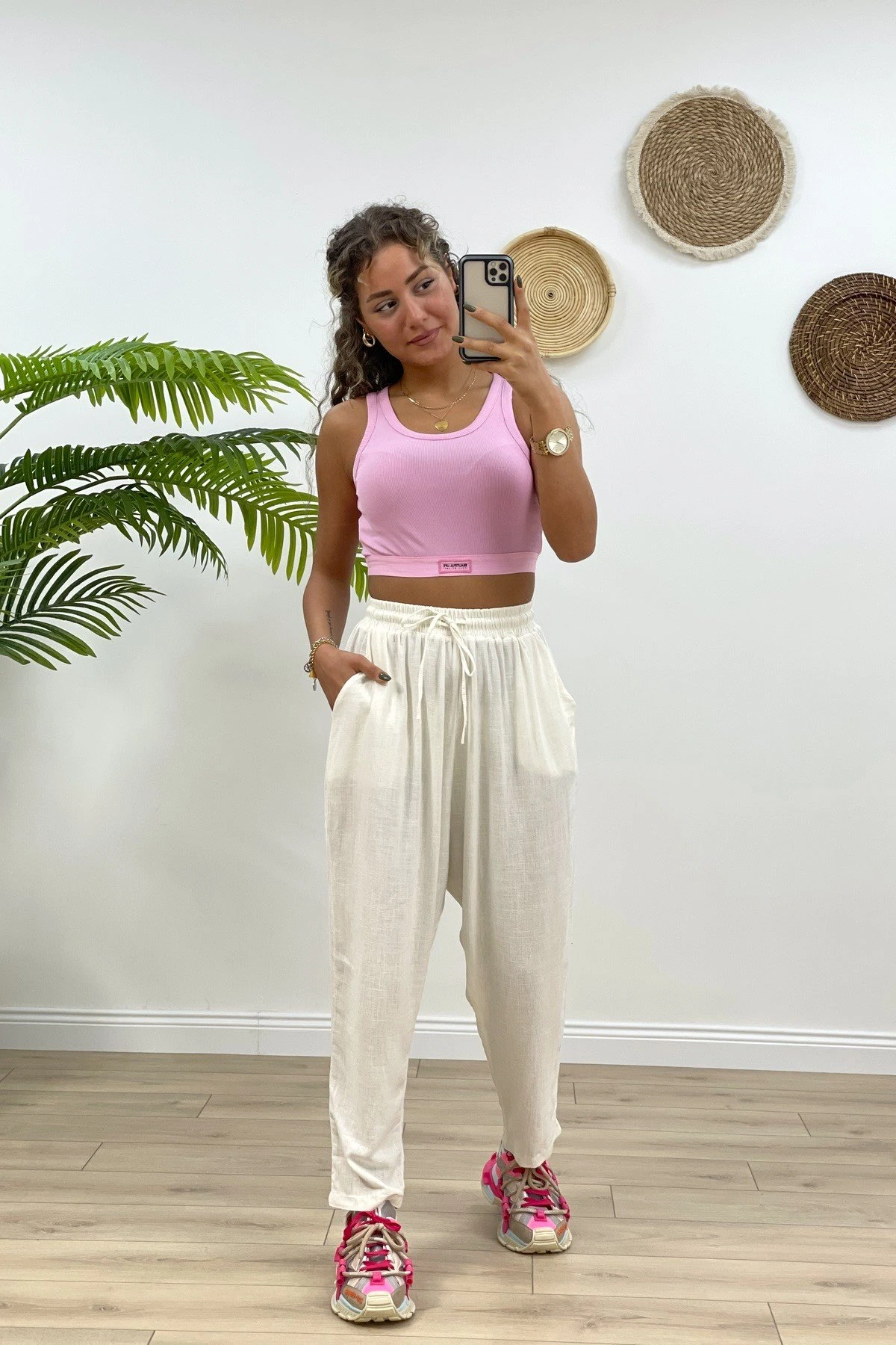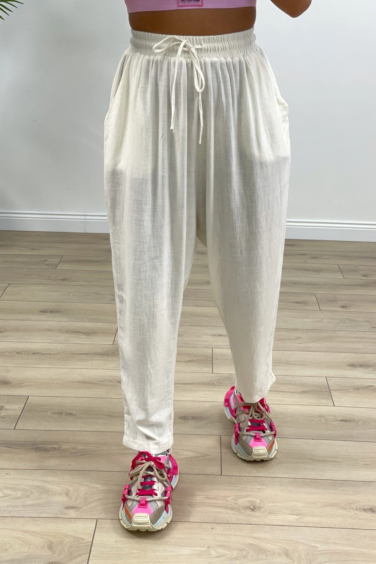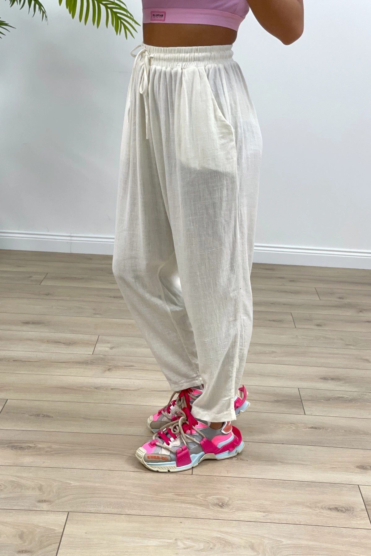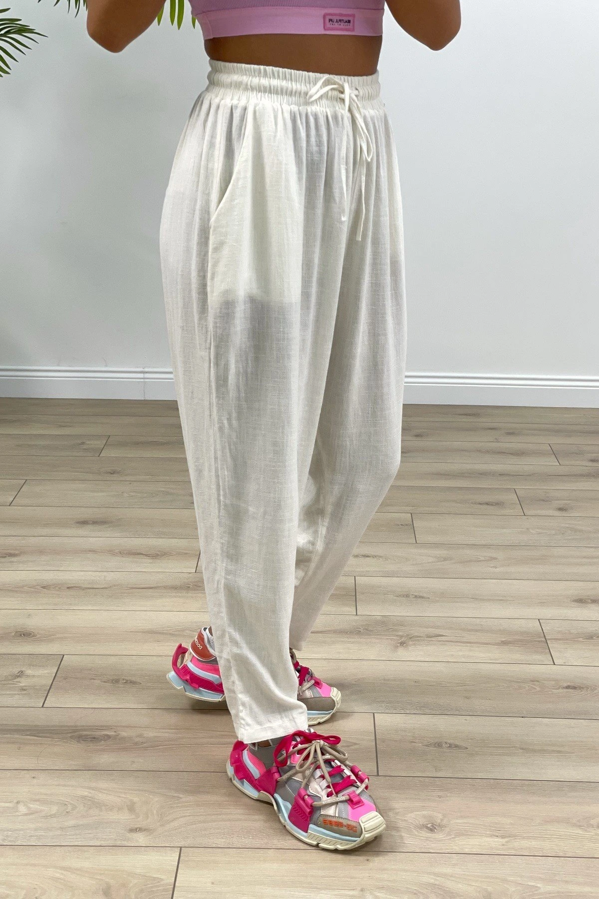 BEL LASTİKLİ CEPLİ ŞALVAR KETEN PANTOLON – EKRU