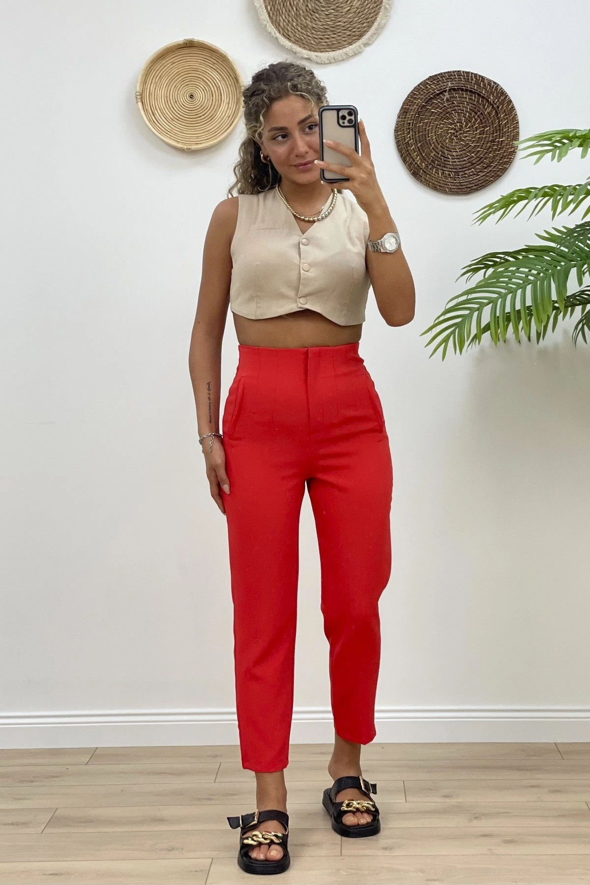 BEL V DETAY PİLELİ KUMAŞ PANTOLON – KİREMİT
