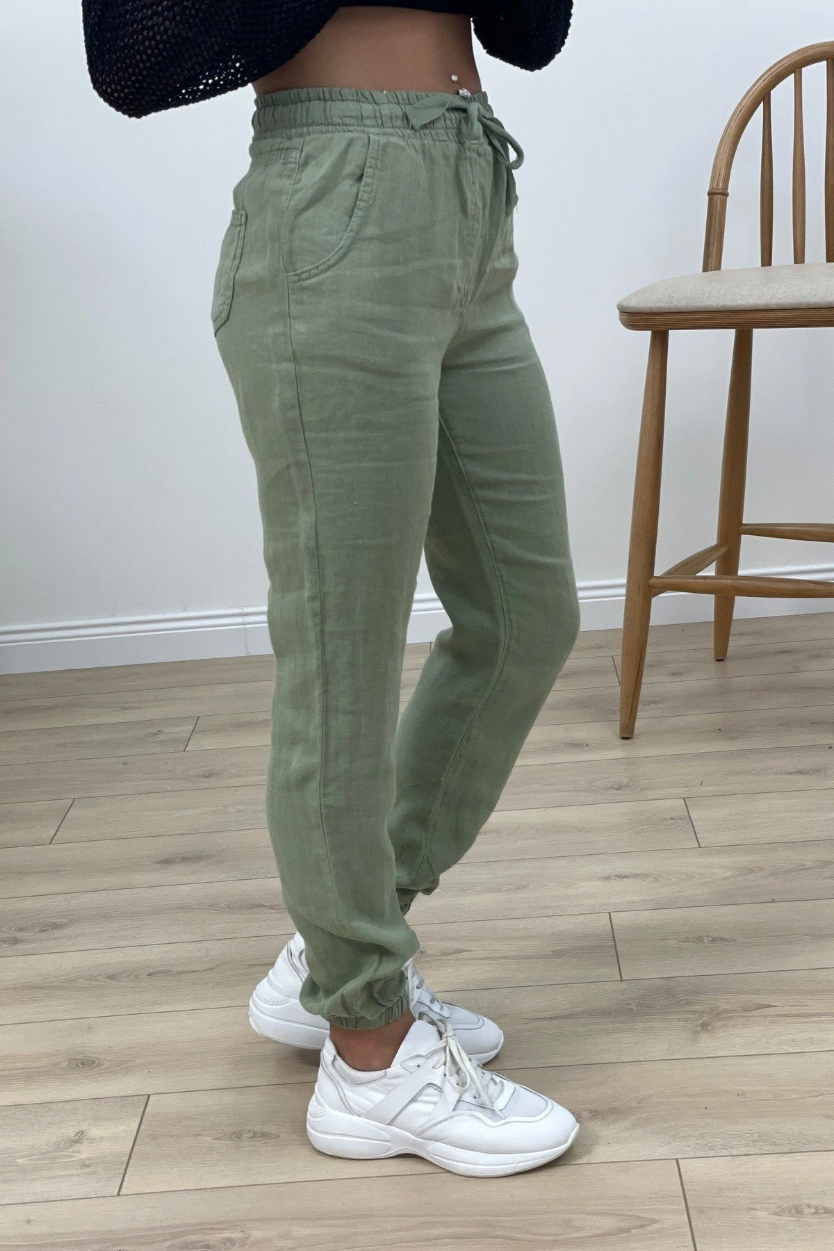 BEL VE BİLEK LASTİKLİ CEPLİ KETEN PANTOLON – AÇIK HAKİ