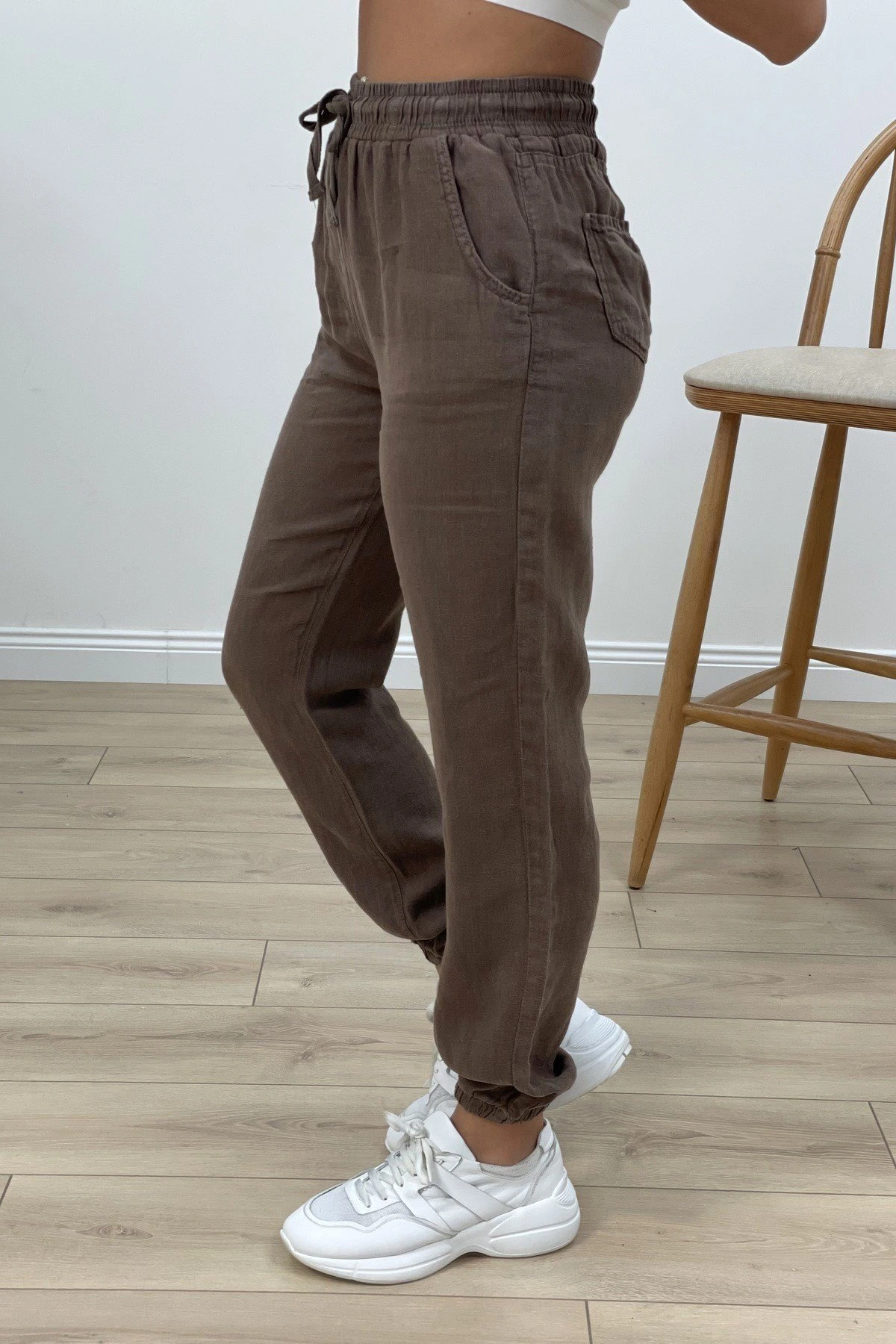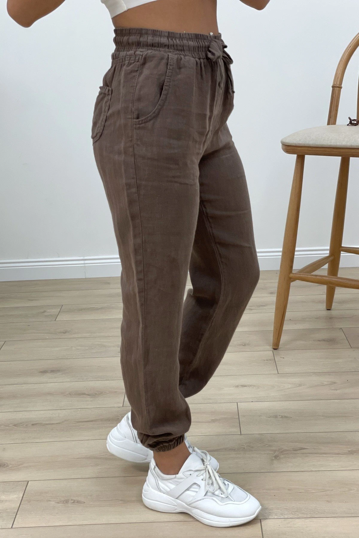 BEL VE BİLEK LASTİKLİ CEPLİ KETEN PANTOLON – KAKAO