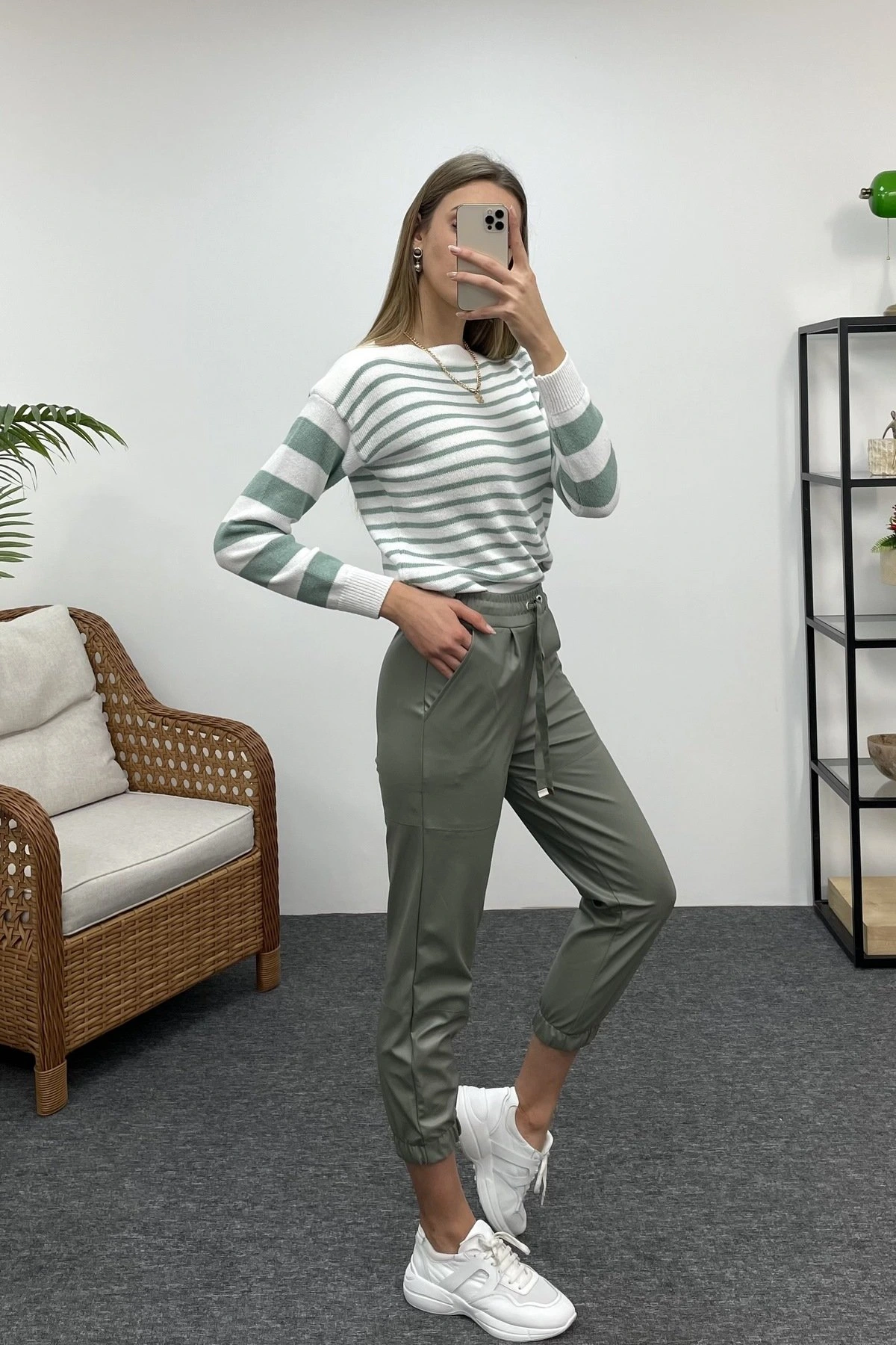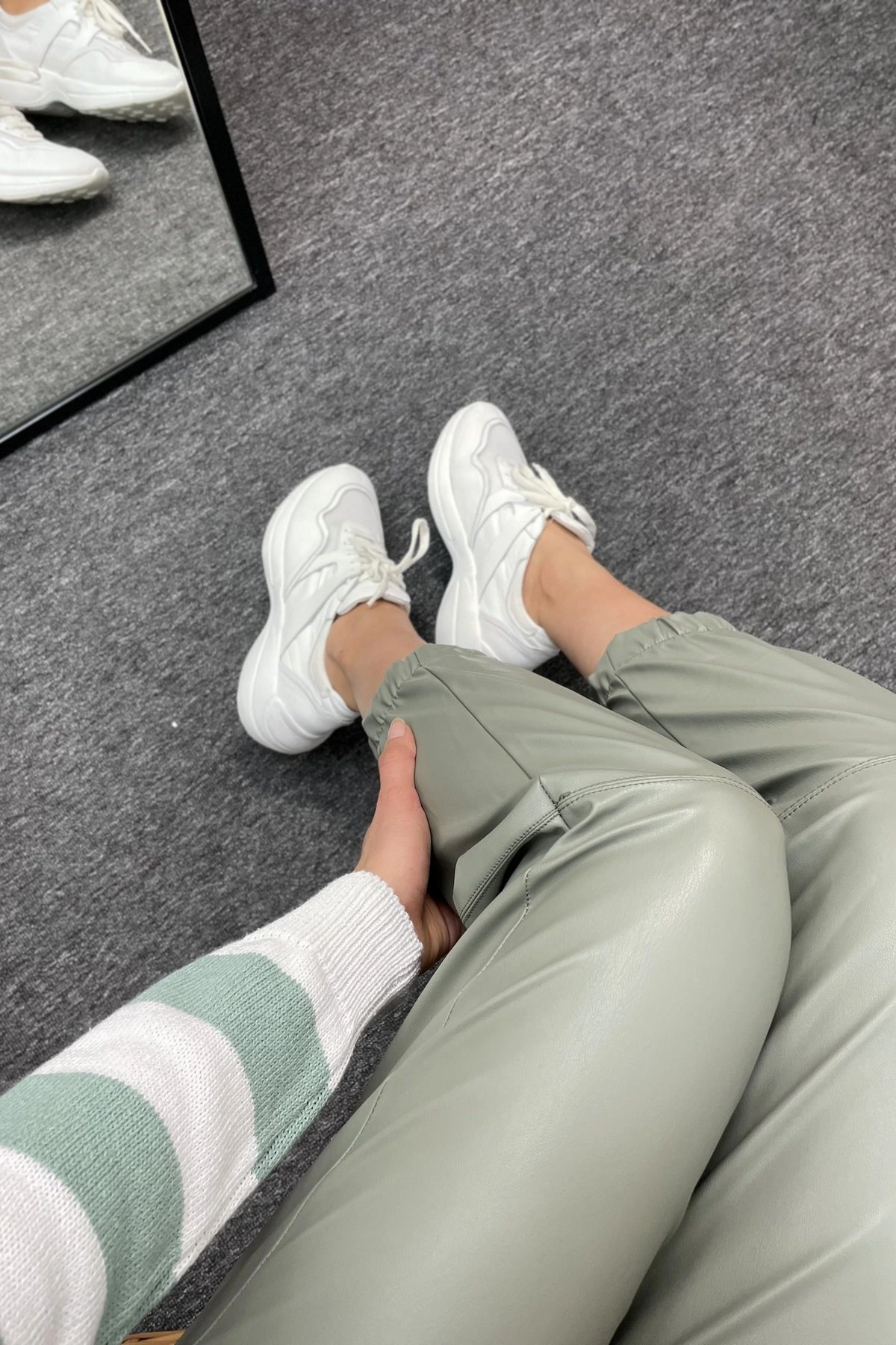 BEL VE BİLEK LASTİKLİ DERİ PANTOLON – KÜF YEŞİLİ