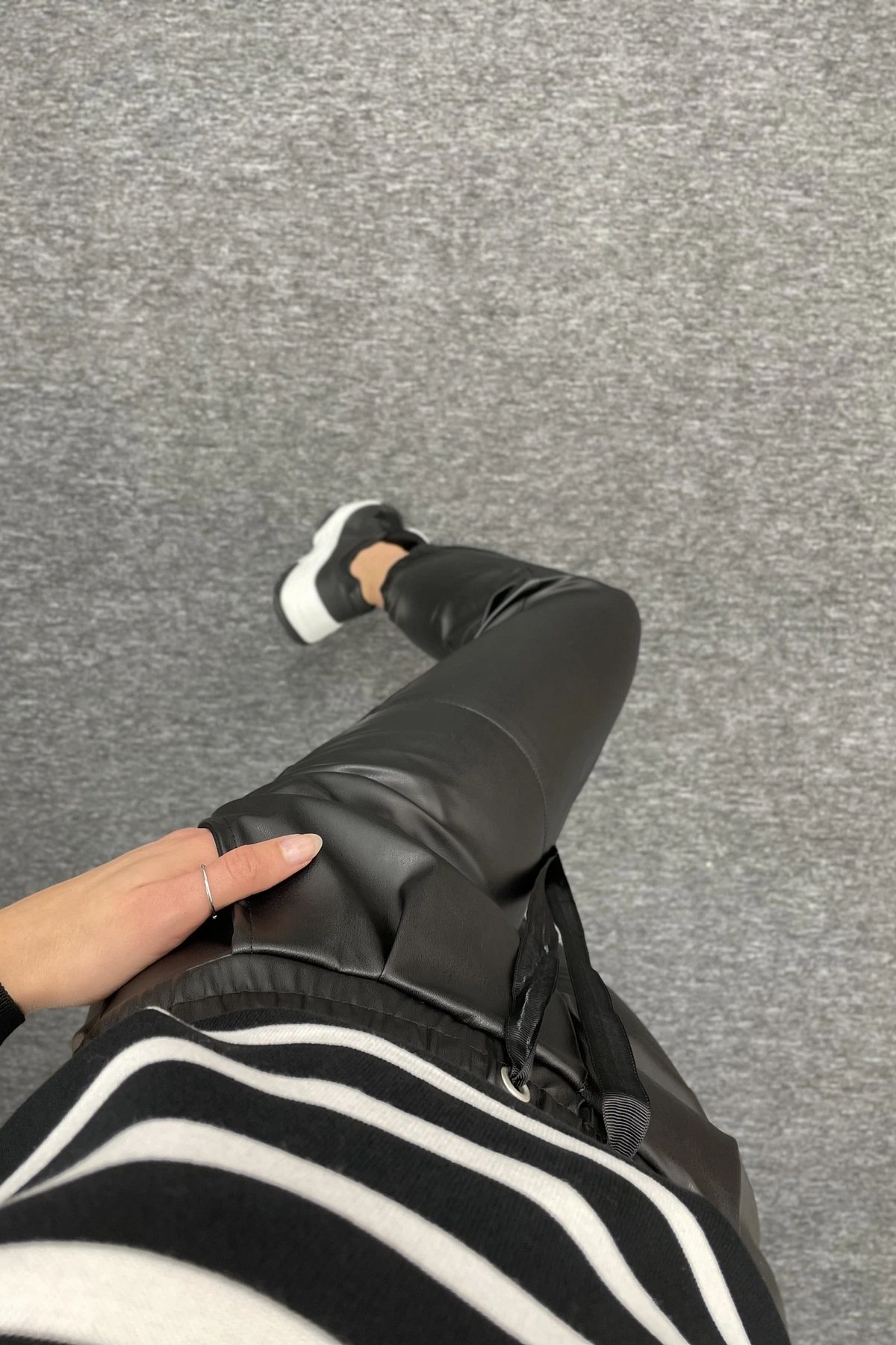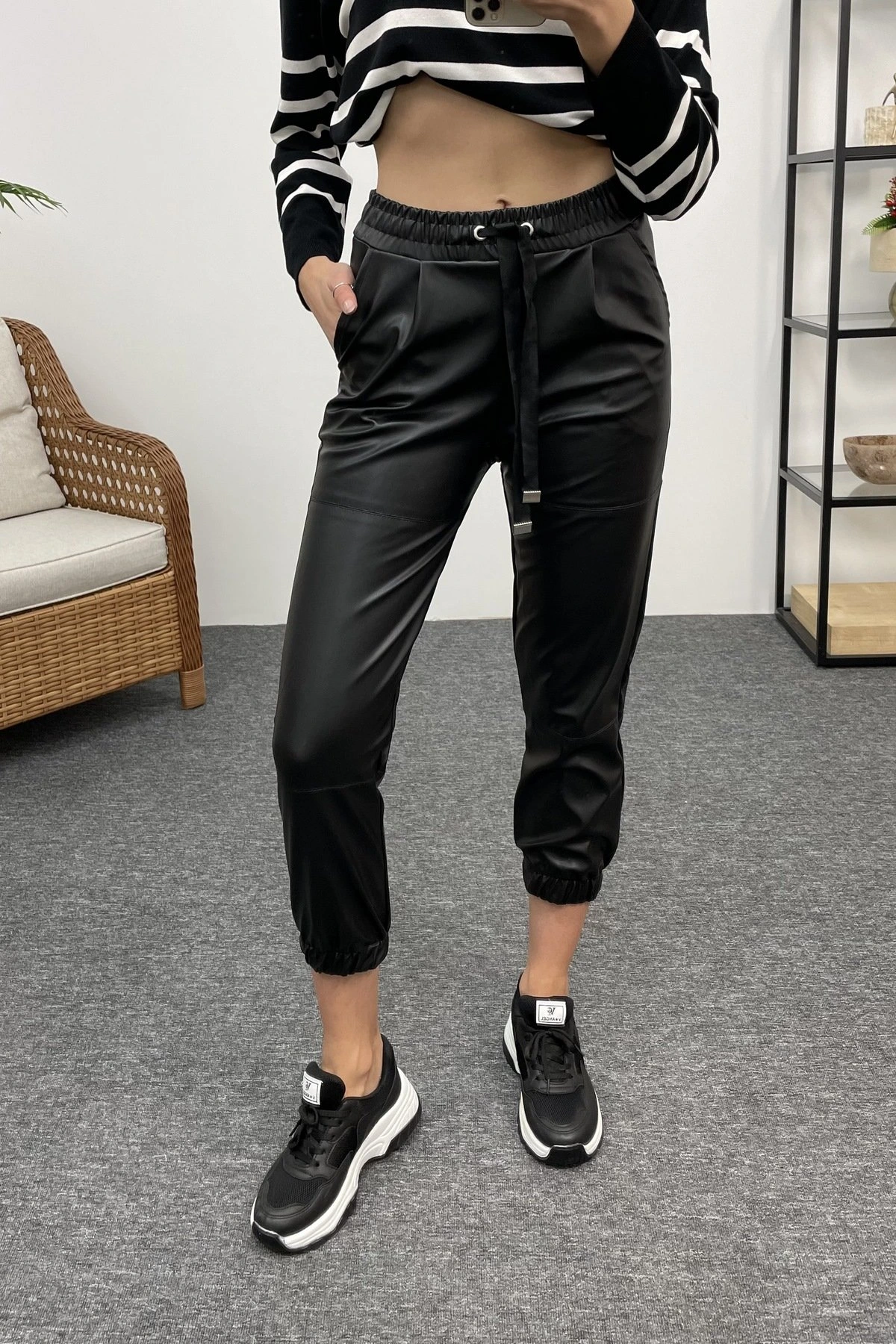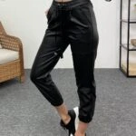 BEL VE BİLEK LASTİKLİ DERİ PANTOLON – SİYAH