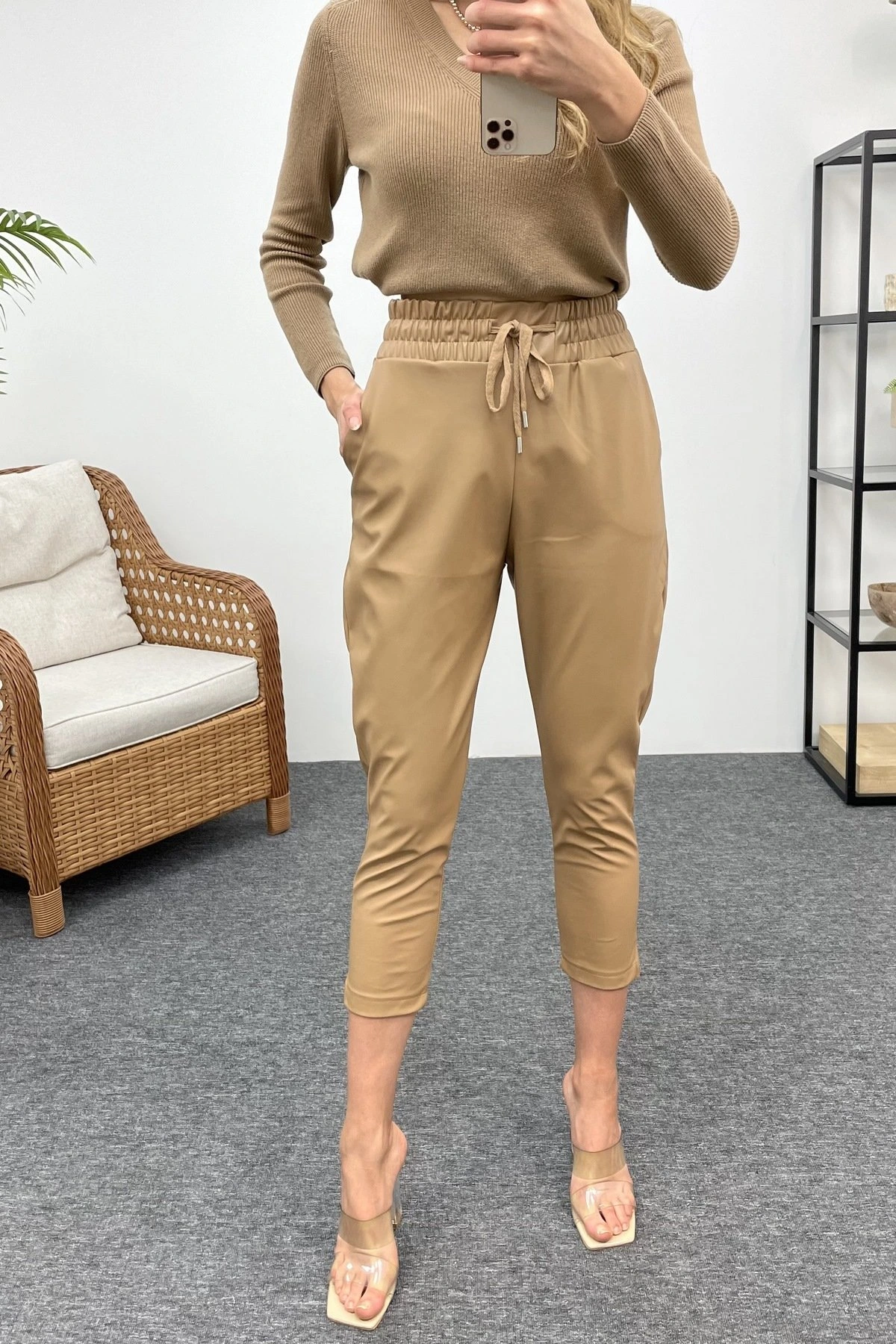 BELİ LASTİKLİ DERİ PANTOLON – BEJ