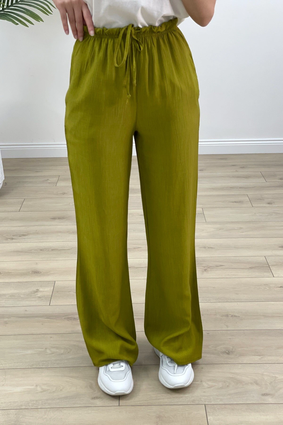 BELİ LASTİKLİ YÜKSEK BEL BOL PAÇA PANTOLON – YAĞ YEŞİL