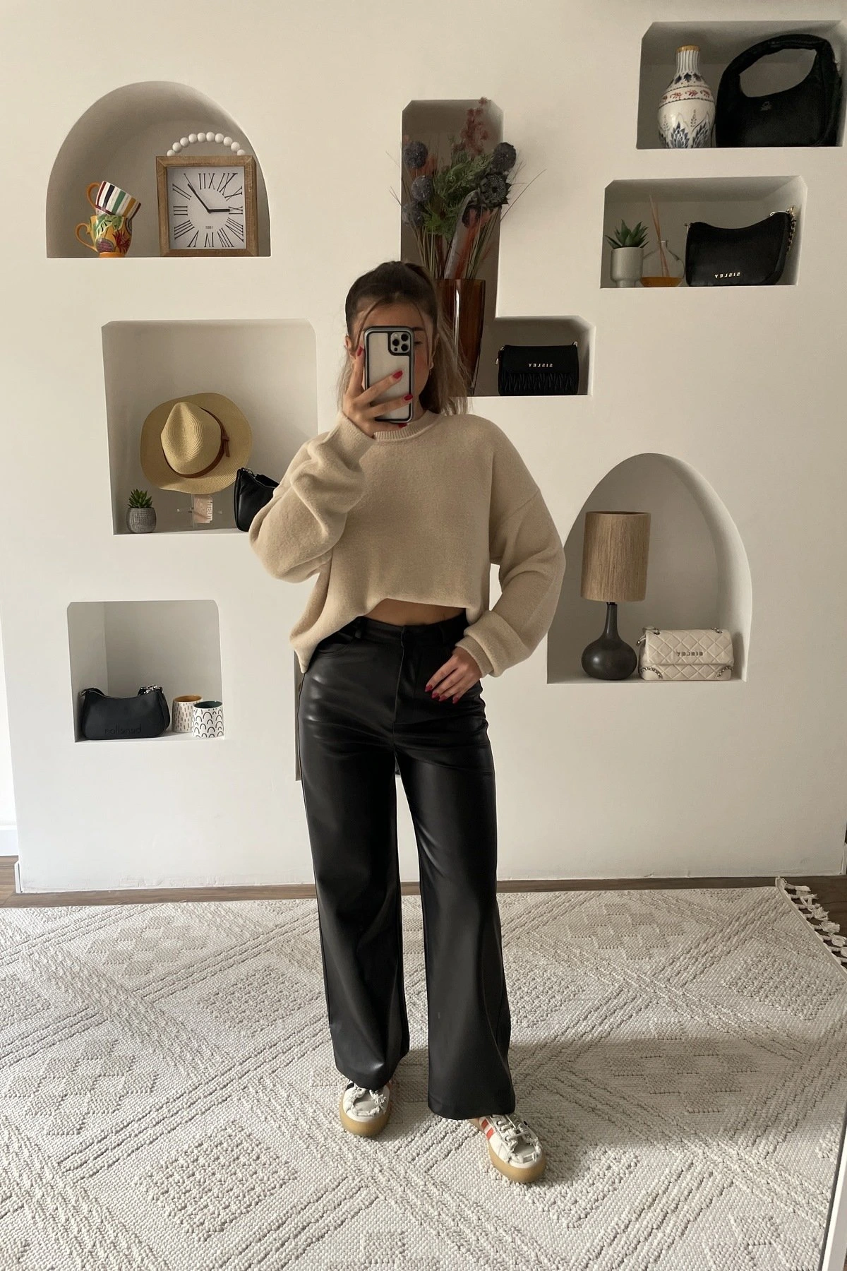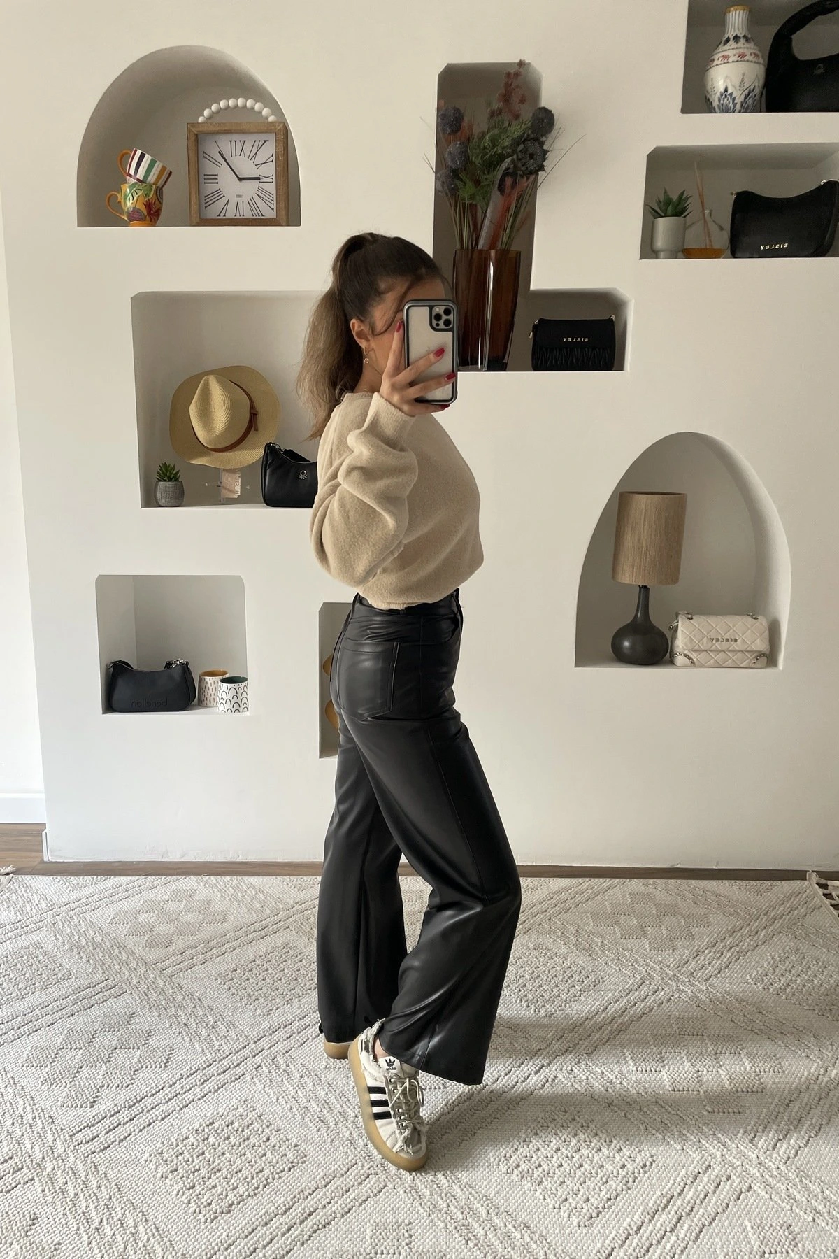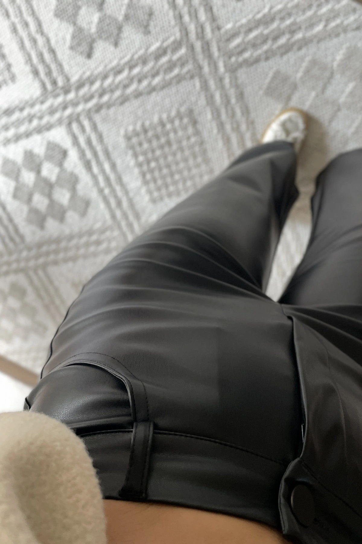 BOL PAÇA CEPLİ DERİ PANTOLON – SİYAH