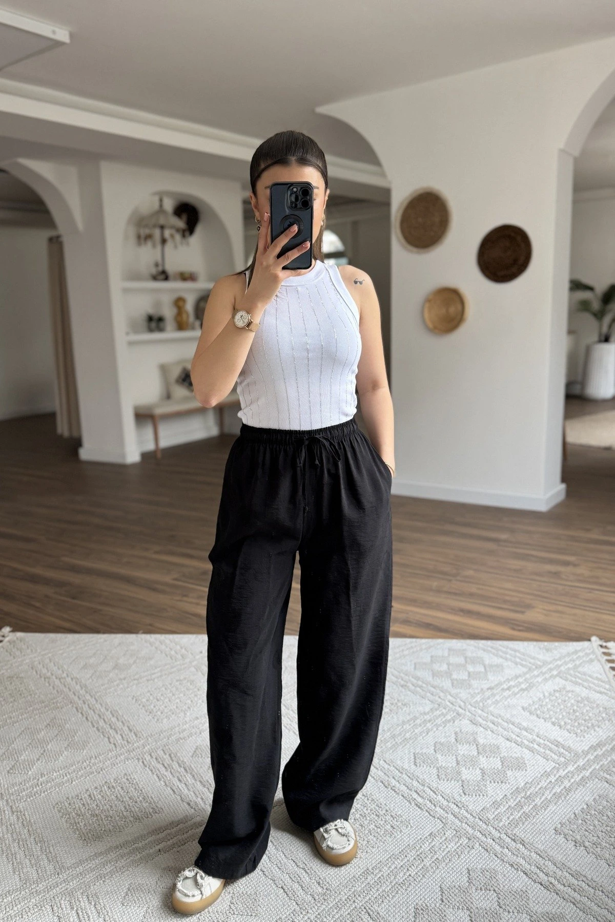 CEPLİ ÇİÇEK DOKU DESEN VİSKON TENSEL PANTOLON – SİYAH