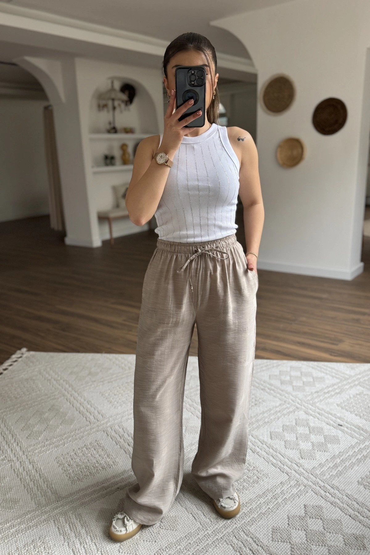 CEPLİ ÇİÇEK DOKU DESEN VİSKON TENSEL PANTOLON - TAŞ