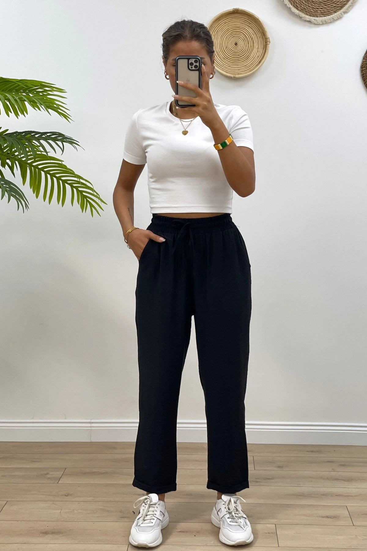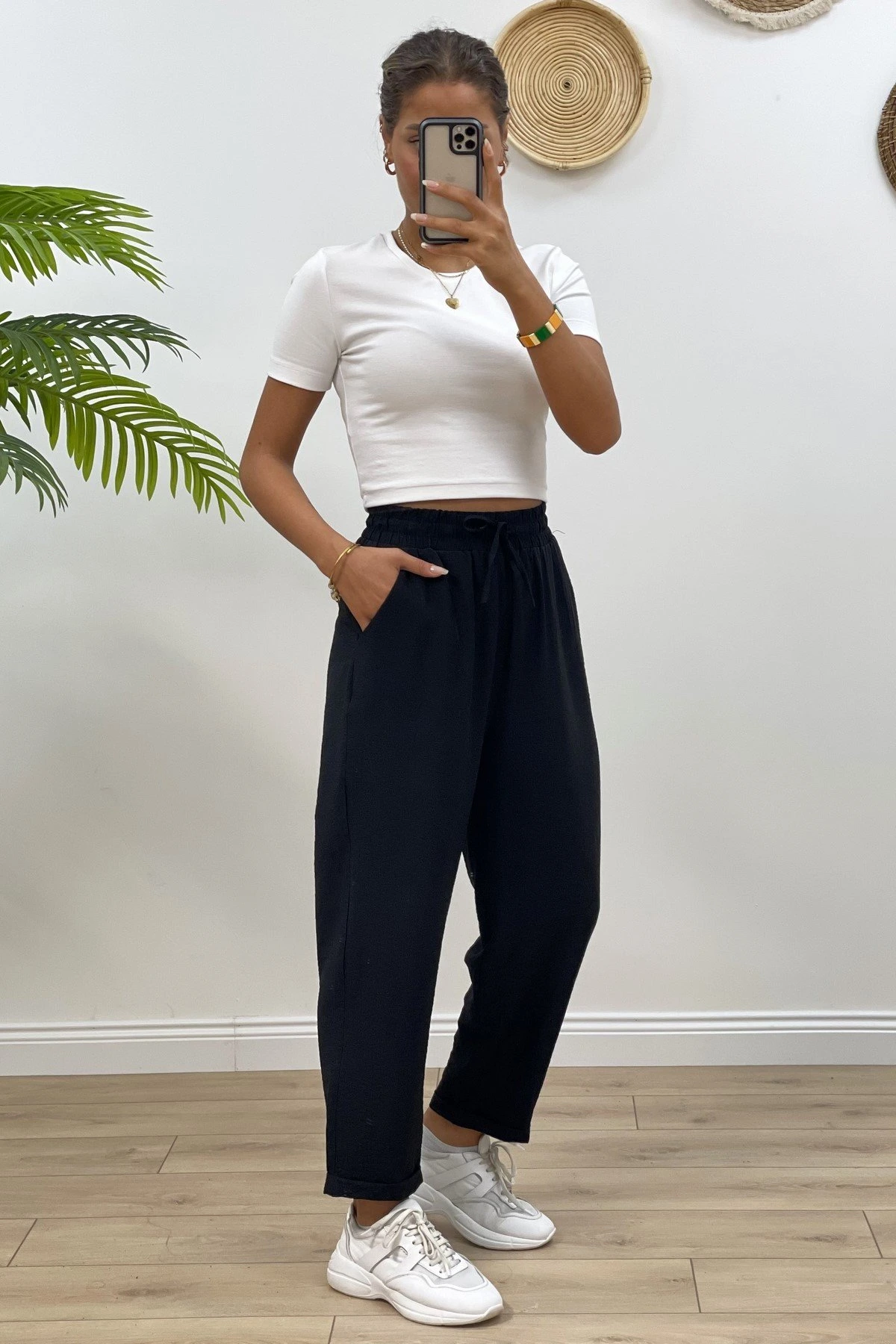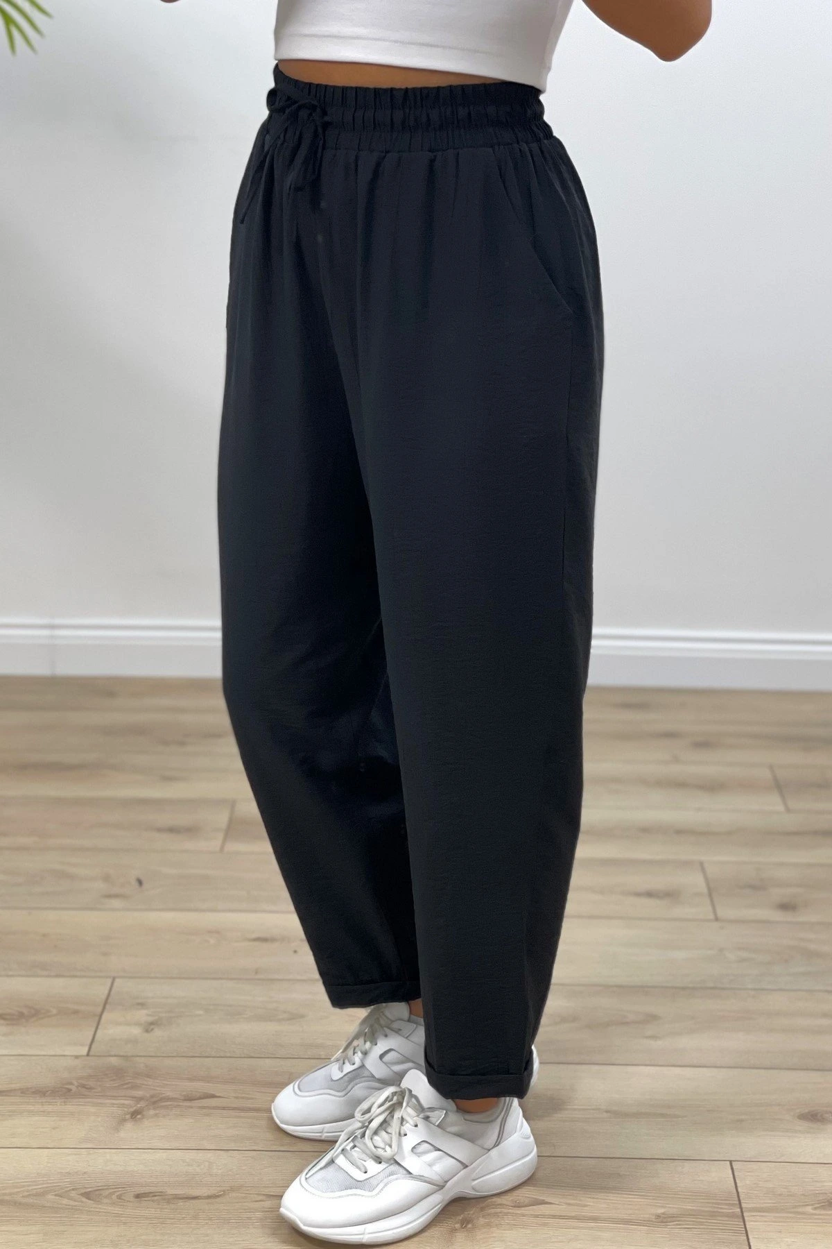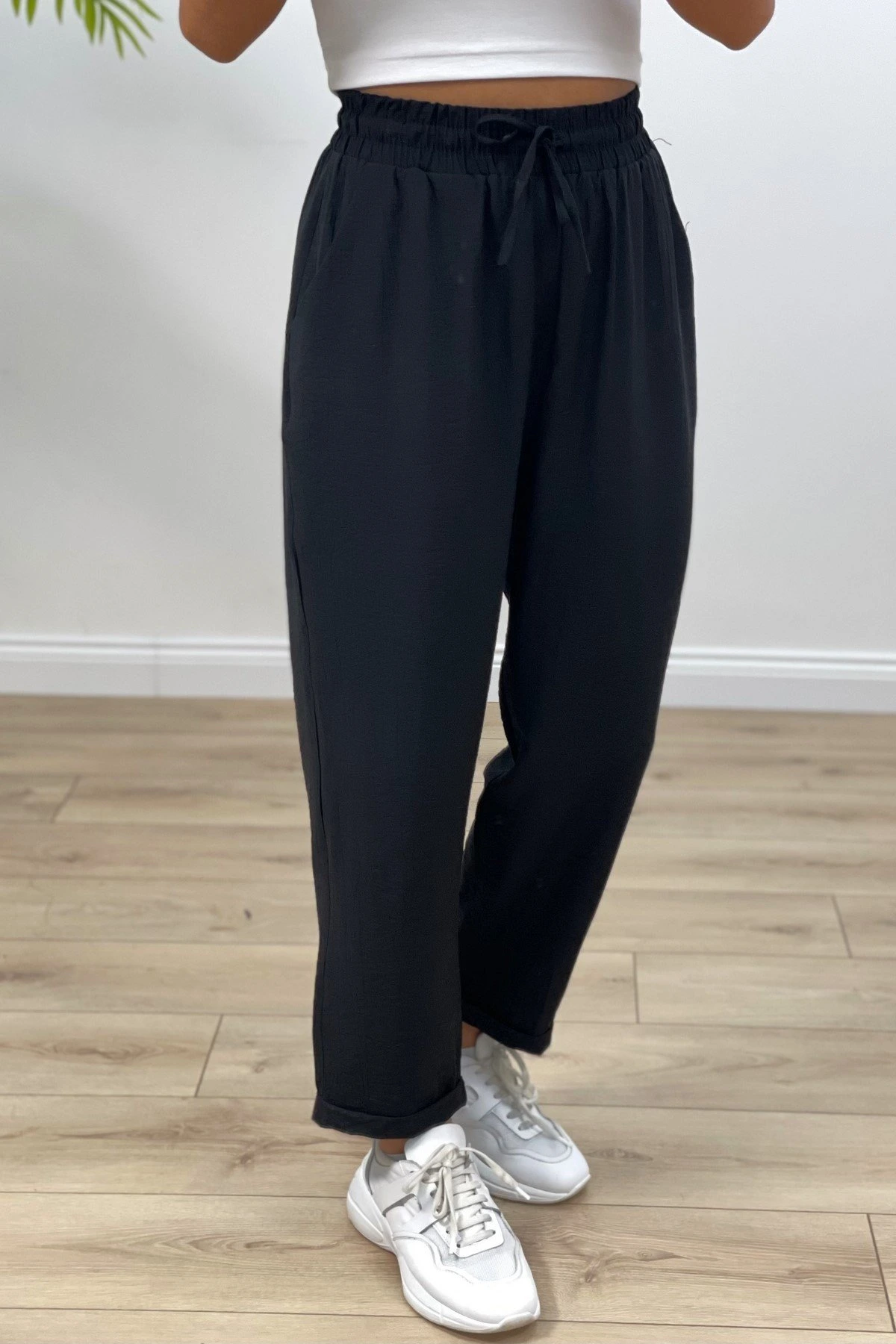 CEPLİ DUBLE PAÇA VİSKON PANTOLON – SİYAH