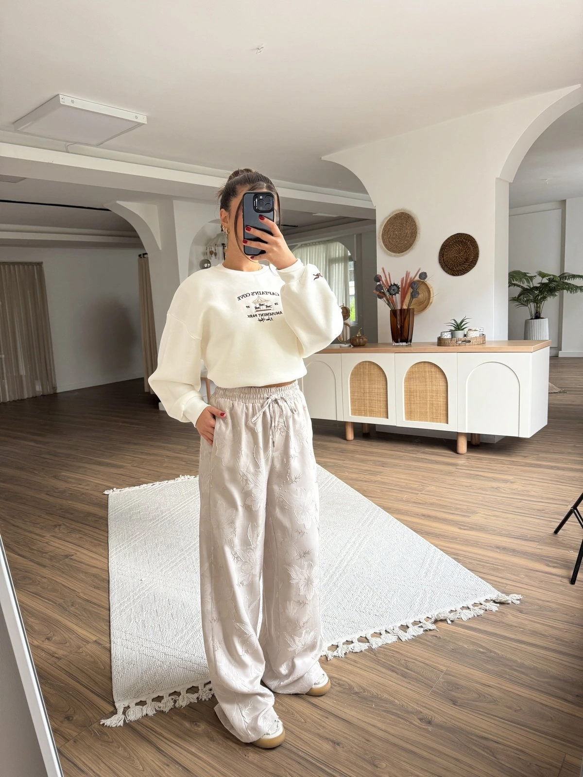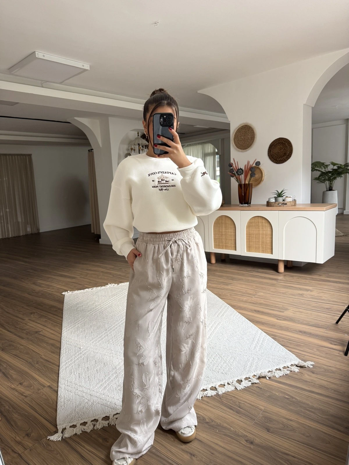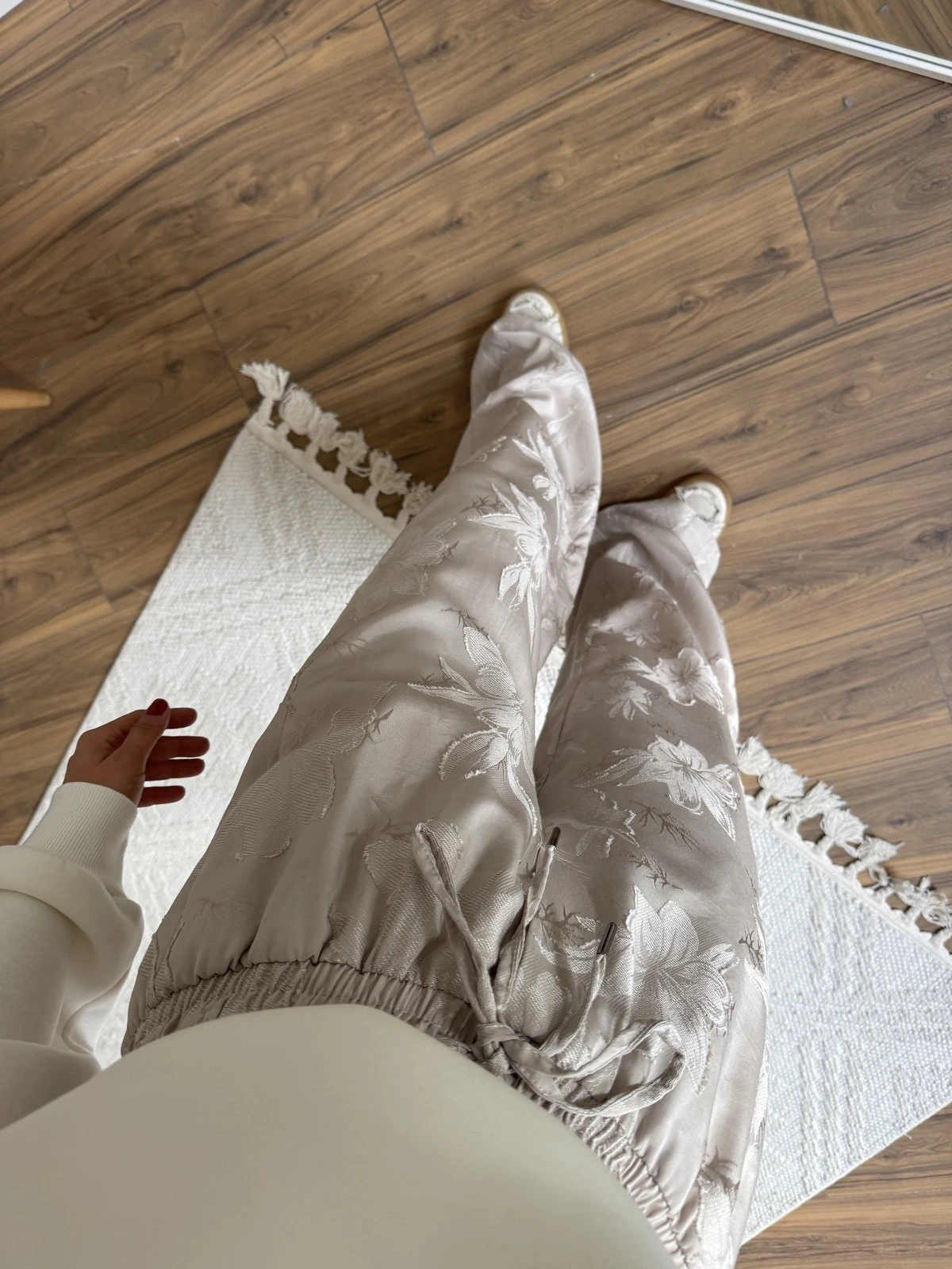 ÇİÇEK DOKU DESEN CEPLİ VİSKON RAHAT PANTOLON – TAŞ