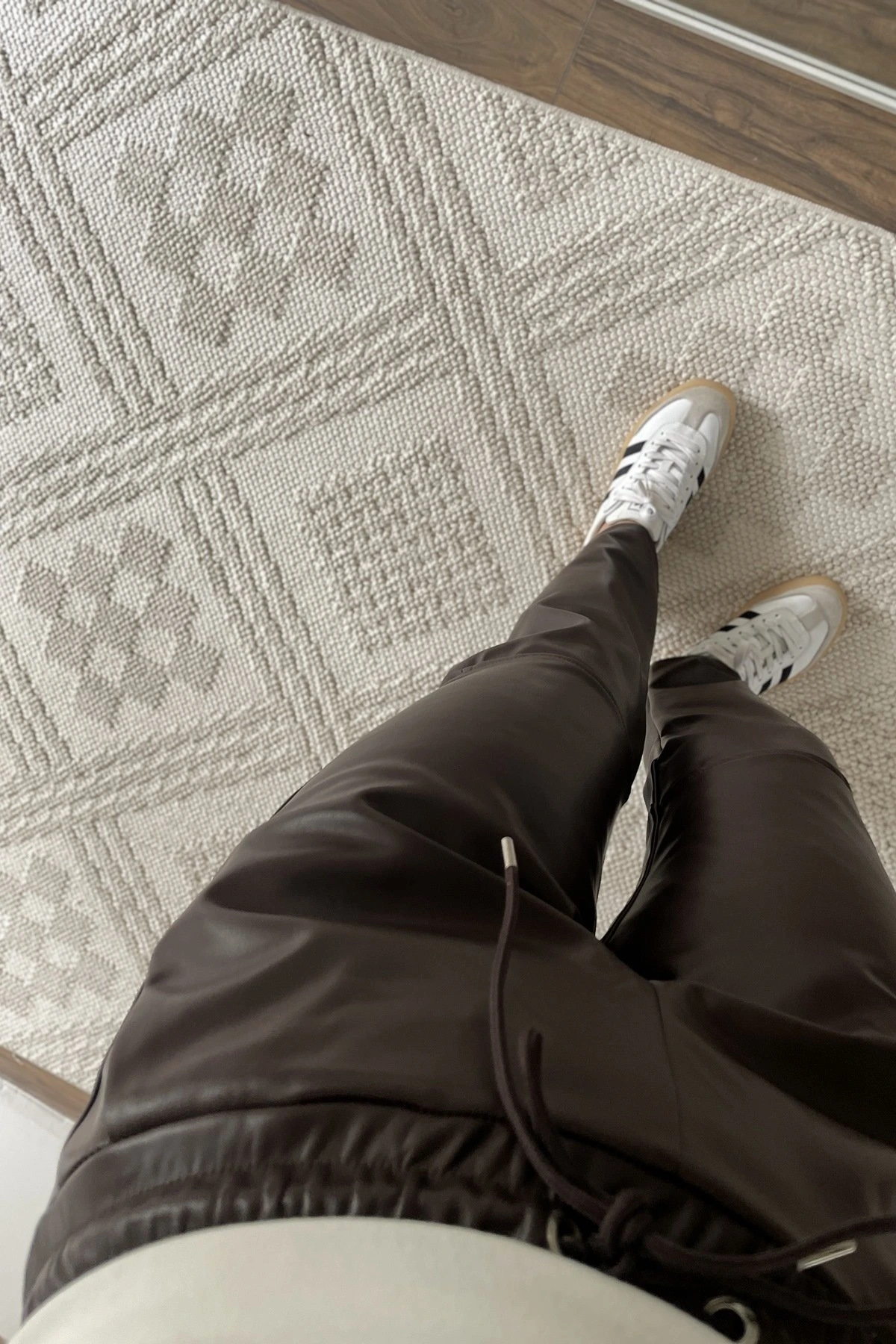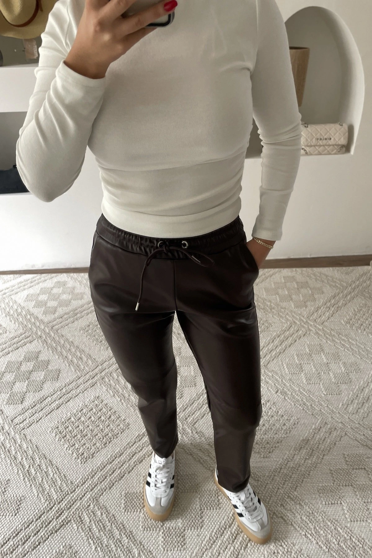 DİZ DİKİŞ BEL LASTİK DERİ PANTOLON – KOYU KAHVE