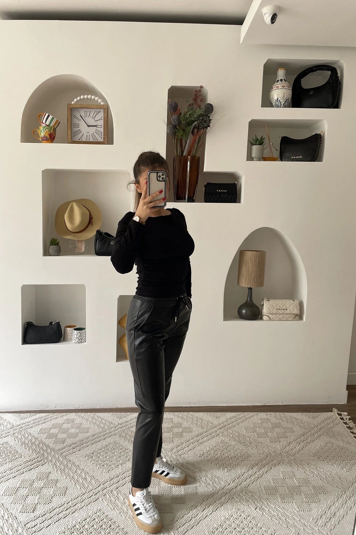 DİZ DİKİŞ BEL LASTİK DERİ PANTOLON – SİYAH
