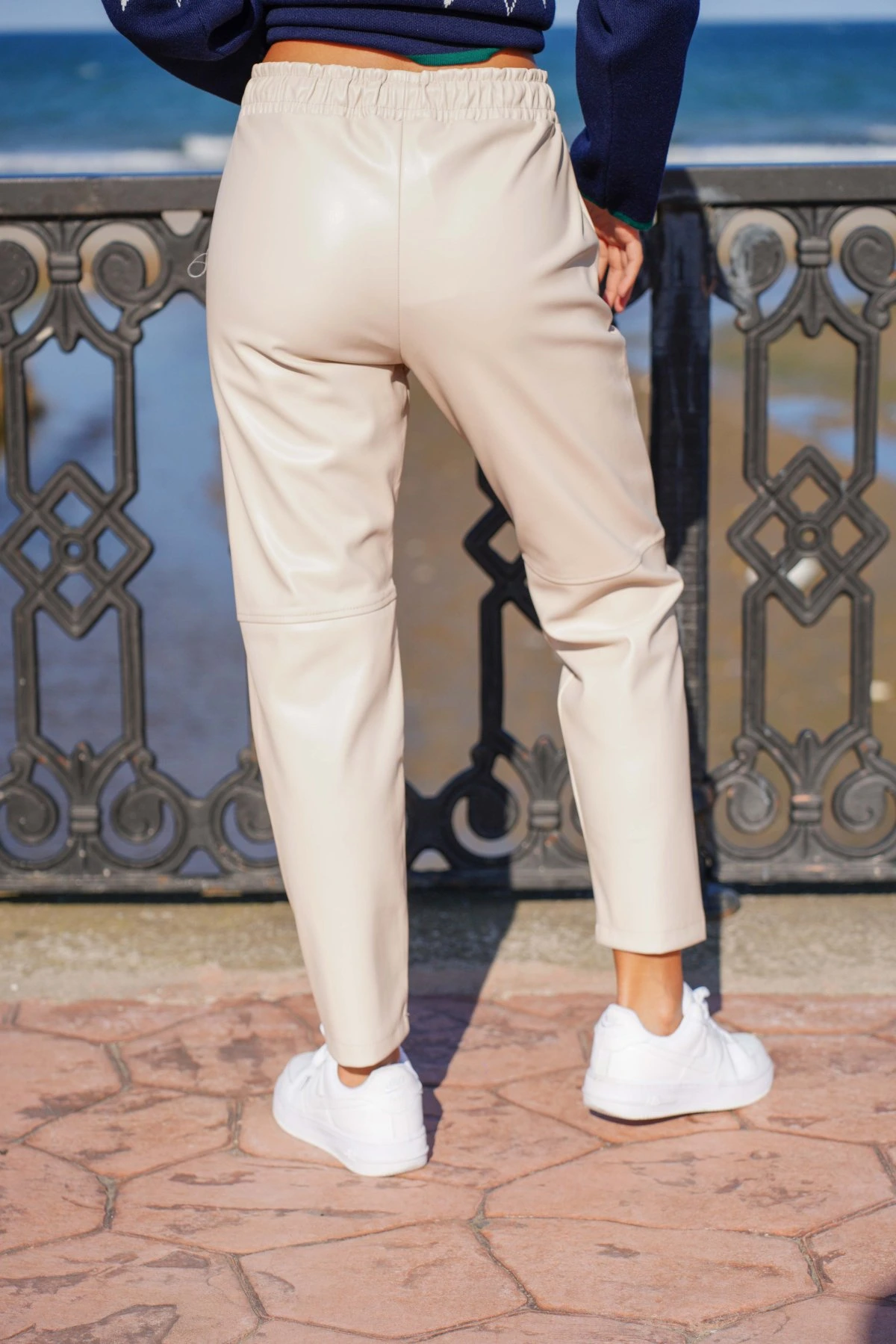 DİZ DİKİŞLİ BEL LASTİK CEPLİ DERİ PANTOLON – BEJ